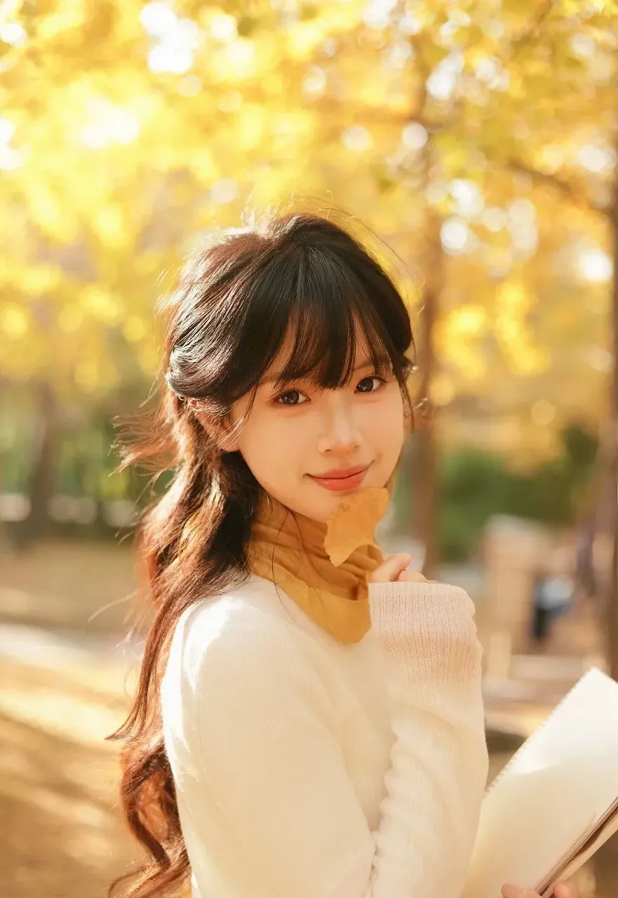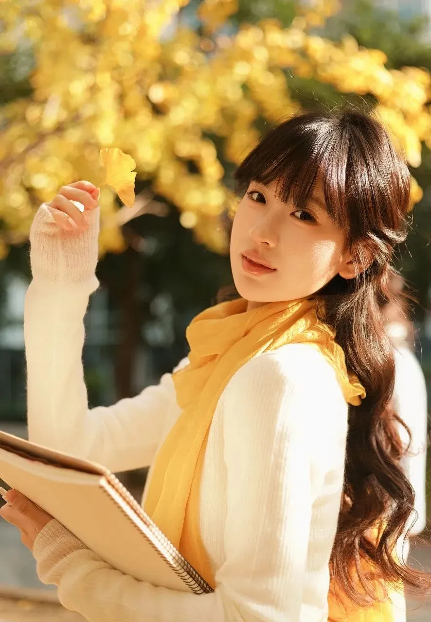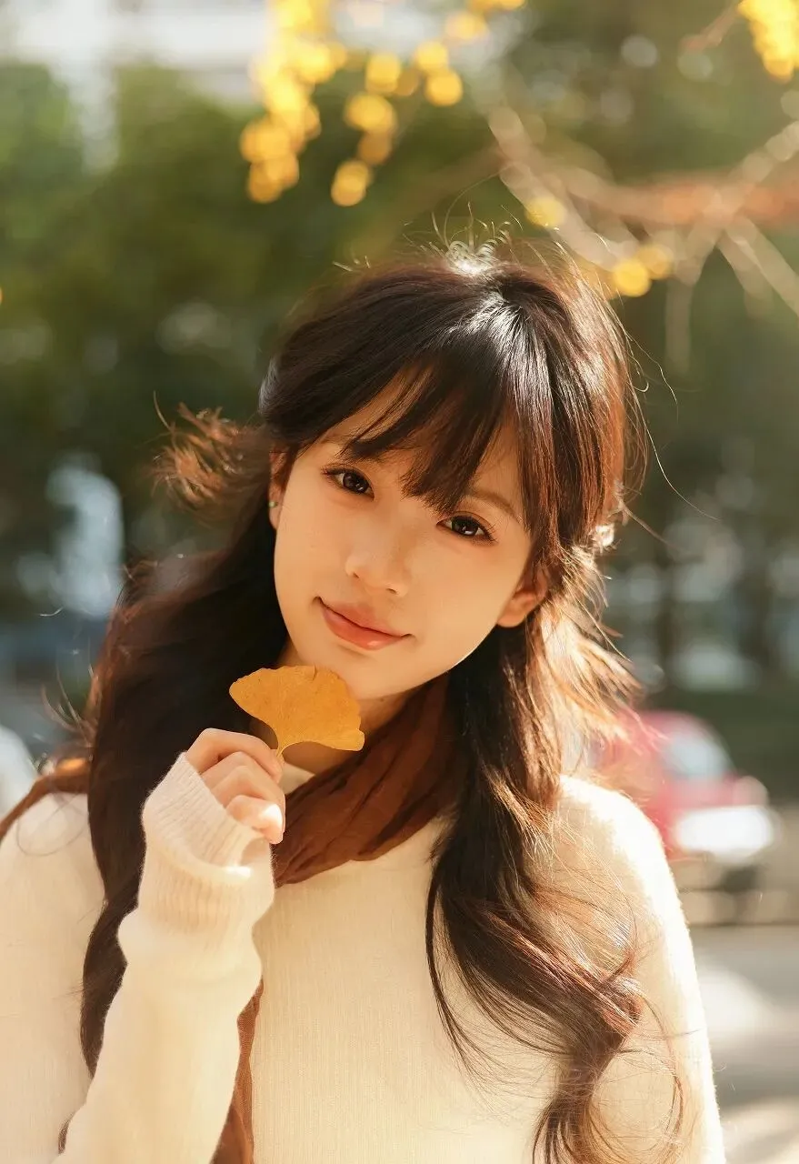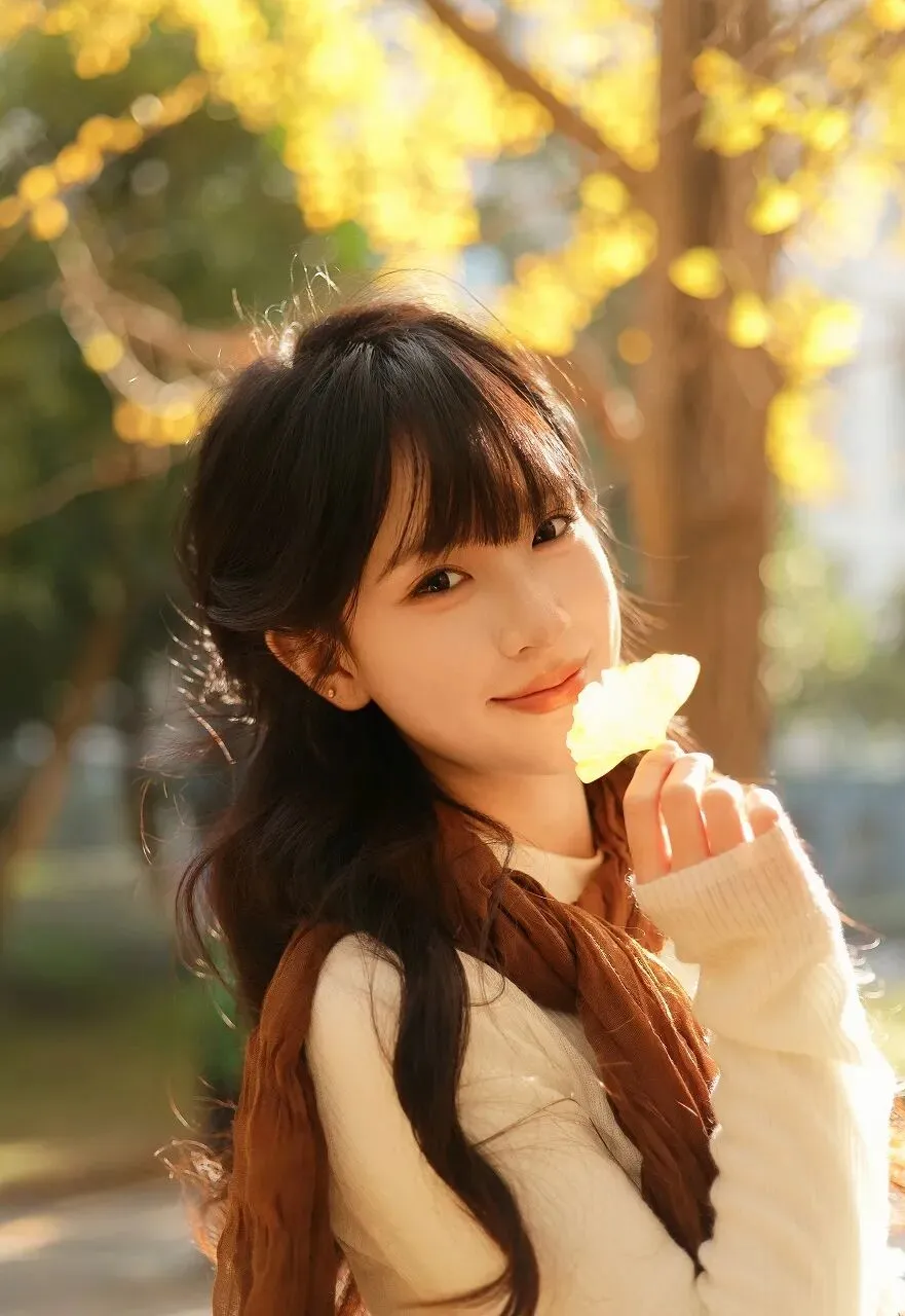 秋天,是一首静谧而又深沉的诗,每一片落叶都是跳动的音符,奏响着季节的恋歌。在这个金黄与温暖交织的季节里,一位少女与银杏的邂逅,如同诗中最美的篇章,散发着宁静、文艺与温柔的气息。画面中的少女,身着一件洁白的针织毛衣,毛衣的纹理细腻而柔和,仿佛是秋日里的一抹纯净月光。她的脖子上随意地围着一条明黄色的围巾,那鲜艳的色彩如同秋日暖阳,瞬间点亮了整个画面。围巾的材质轻盈飘逸,在微风中轻轻拂动,为少女增添了几分灵动与俏皮。她的头发乌黑亮丽,如瀑布般垂落在肩头,发梢微微卷曲,带着一丝慵懒的韵味。此刻,少女的手中轻轻捏着一片金黄的银杏叶,她的眼神温柔而专注,凝视着这片小小的叶子,仿佛在与它进行一场无声的对话。银杏叶的形状宛如一把小巧的扇子,边缘有着自然的波浪纹路,在阳光的照耀下,闪烁着金色的光芒,宛如一件精美的艺术品。这片叶子,或许是从身旁的银杏树上飘落,带着秋天的思念与祝福,落在了少女的手心。