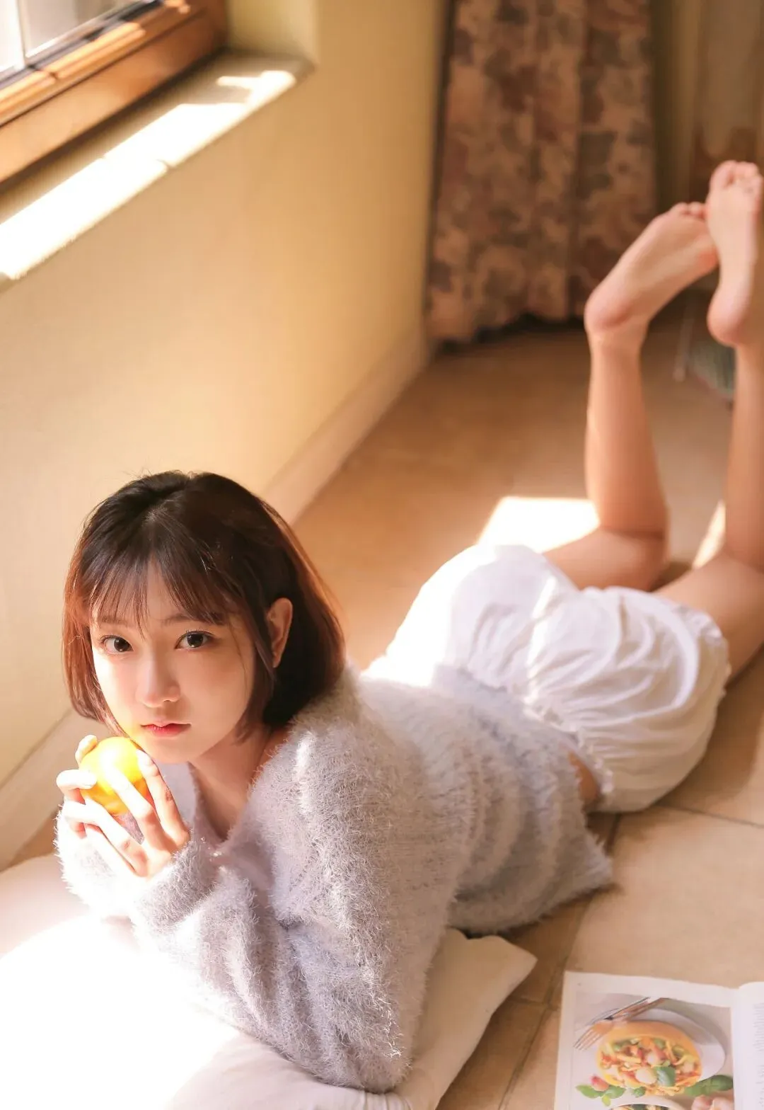 在生活的喧嚣与忙碌中,我们总是像不停旋转的陀螺,被各种琐事和责任驱赶着前行。然而,总有那么一些瞬间,我们渴望停下脚步,寻一方宁静的角落,享受一段独属于自我的惬意时光。就像在一个阳光倾洒的午后,慵懒地趴在窗边,与温暖相拥,与内心对话。画面中的女孩,身着一件浅灰色的毛绒毛衣,那柔软的质地仿佛能让人感受到云朵般的轻柔触感。毛衣的绒毛在阳光的照耀下闪烁着细微的光芒,如同夜空中闪烁的繁星,为整体造型增添了一份梦幻的氛围。下身搭配的白色短裤,简洁而干净,与毛衣的柔和色调形成了鲜明的对比,却又在不经意间达到了和谐的统一。她光着脚丫,双腿随意地翘起,姿态放松而又自然,仿佛整个世界都只剩下这一片小小的宁静天地。她的脸颊轻轻地贴在手臂上,手中紧紧握着一个黄色的水果,可能是香甜的橙子,也可能是饱满的柠檬。水果鲜艳的色彩在整体柔和的色调中显得格外突出,为画面增添了一抹灵动的生机。她的眼神平静而温和,望向镜头,又仿佛穿透镜头,看向远方,那眼神中藏着对生活的淡淡期许,也藏着对这片刻宁静的深深眷恋。