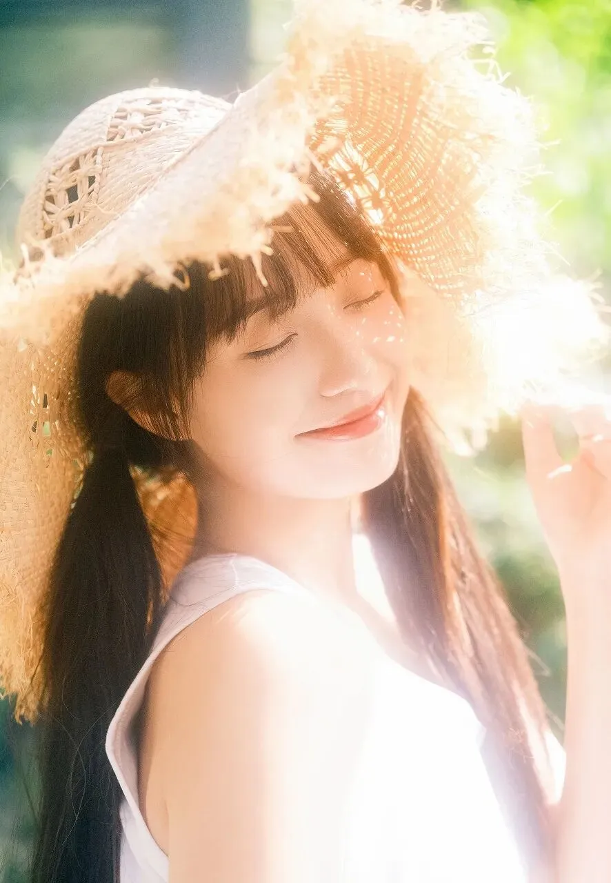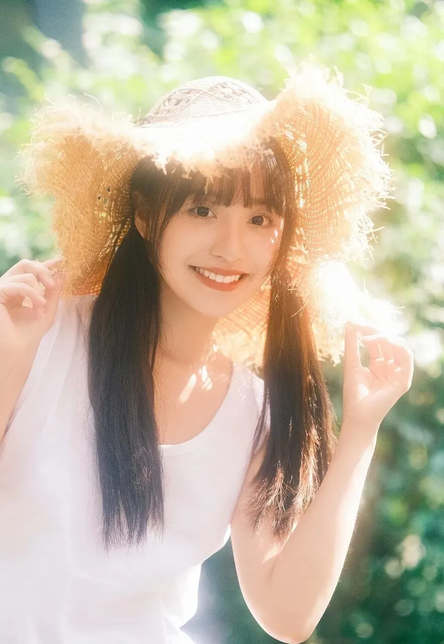 在她的身旁,一顶宽边的草帽随意地放置着。草帽的材质看起来粗糙却又充满质感,边缘的毛边自然散落,带着一种随性的美。草帽上有着镂空的格子图案,阳光透过这些格子,在地面上投射出斑驳的光影,仿佛是一幅天然的画作。草帽不仅是一件遮阳的实用物品,更成为了少女夏日造型的一部分,增添了几分田园风情。而另一侧,半个鲜红的西瓜静静地躺在石阶上。西瓜的外皮是深绿色与浅绿色相间的条纹,如同大自然精心绘制的图案。切开的部分,鲜红的果肉鲜艳欲滴,汁水仿佛要溢出来一般,黑色的瓜子镶嵌其中,如同夜空中的繁星。西瓜是夏日的象征,它那清凉甘甜的口感,总能带给人们无尽的满足和惬意。少女的身旁有它相伴,更凸显出夏日的气息和悠闲的氛围。少女所处的背景是一片绿意盎然的景象。茂密的树叶层层叠叠,形成了一片绿色的屏障,遮挡住了部分阳光,只留下星星点点的光斑洒在地面上。石阶的表面有些粗糙,带着岁月的痕迹,它们蜿蜒向上,仿佛通向一个未知的夏日秘境。整个场景充满了自然的气息,让人感受到夏日独有的宁静与美好。