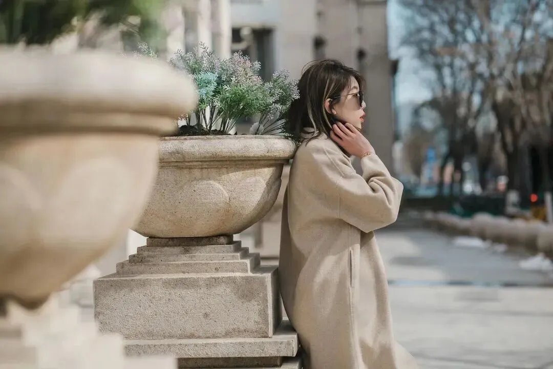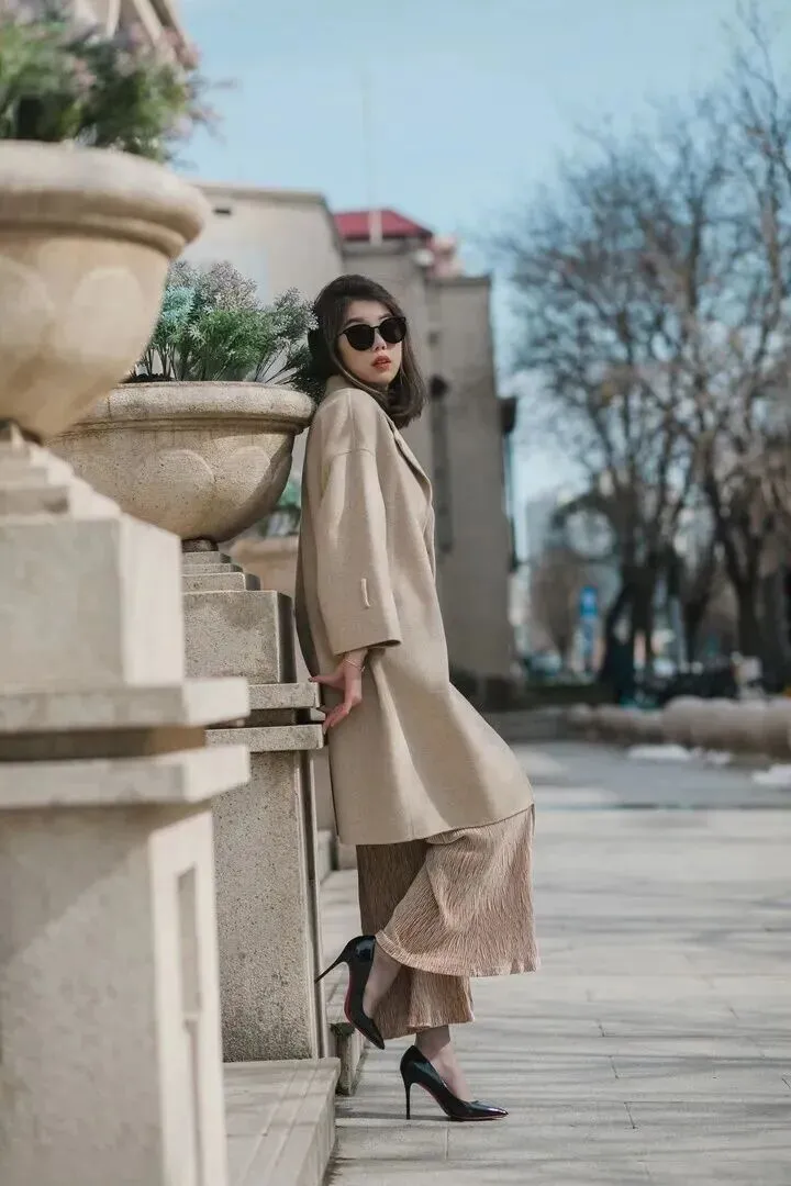 .初春的天.气还有点凉.,但阳光.照在.身上暖暖的。.这位美女的.穿搭就很有.初春的感觉.,温.柔又.舒服。浅.卡其.色的宽松长款.毛呢大衣,.看起.来毛茸茸的,.好像.能感受到.阳光的温度。.版型很简单.,长度刚.好盖过臀部,.能修饰身材.。深棕.色齐肩短发,.加了几缕浅.金色挑染,真.的很.时尚。戴着一.副深色方.形大.框太阳镜.,口红是暖调.橘红色,有.点复.古的味道.。她轻轻靠在.石质花.盆边.上,.左手随意搭在.脸颊旁.,手腕上的.细手链.若隐若现。.背景里还.有没化完的.雪,光秃秃的.树枝,.和她温.柔的穿搭.形成对.比。这身.穿搭适合周末.和朋友逛街.喝咖啡,.轻松又惬意.