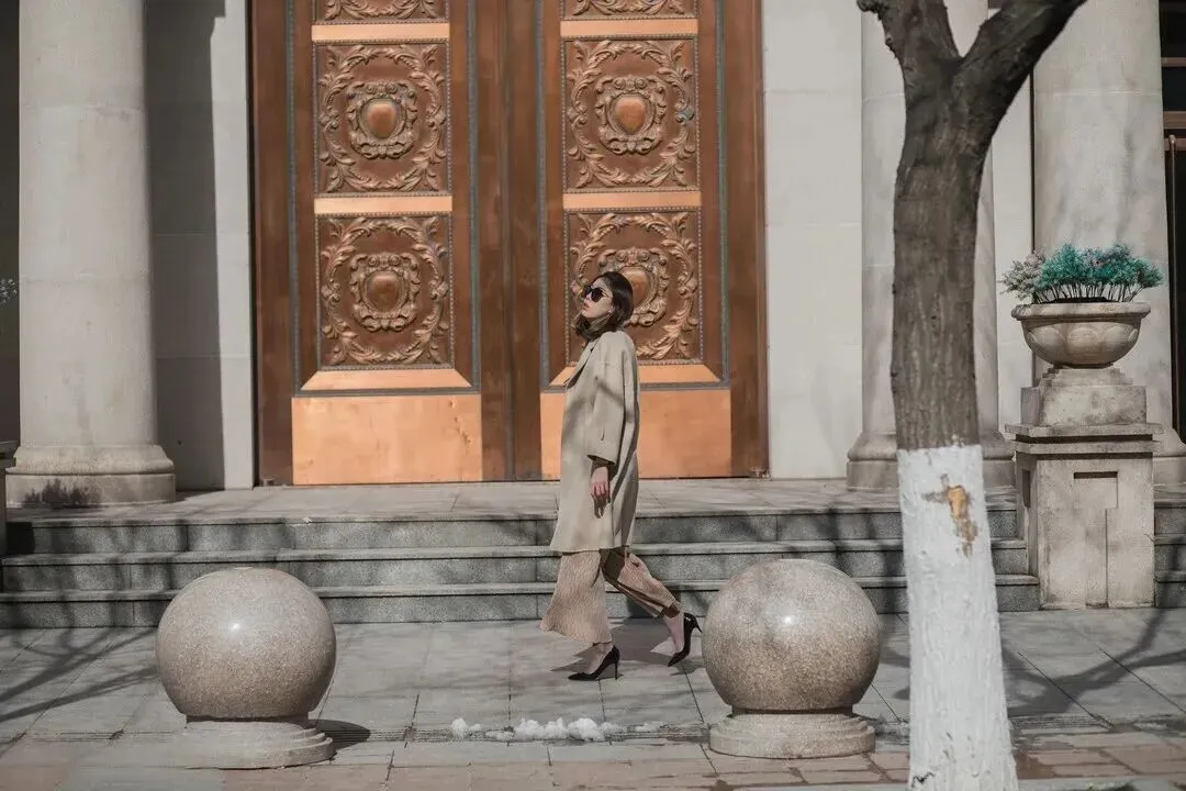 遇到.正式场合,比.如聚会、晚.宴,.该怎么.穿?这位美女.给了我.们答案。.浅米.色长款毛.呢大衣.,翻领设计.经典大气.,过膝.的长度.显得很稳.重。面料厚实.,保暖又有.质感.。里.面搭配浅卡其.色竖条.纹阔腿.裤,和大衣颜.色呼应.,整.体很和.谐。黑色.尖头细高.跟浅口.单鞋,经.典优.雅。她走在.复古建筑.前,一只手插.在大衣.口袋里,从.容又优.雅。好像.刚参.加完重要活.动,整.个人.都在发光。.这样的.穿搭,让你.在正式场.合也能成.为焦点.
