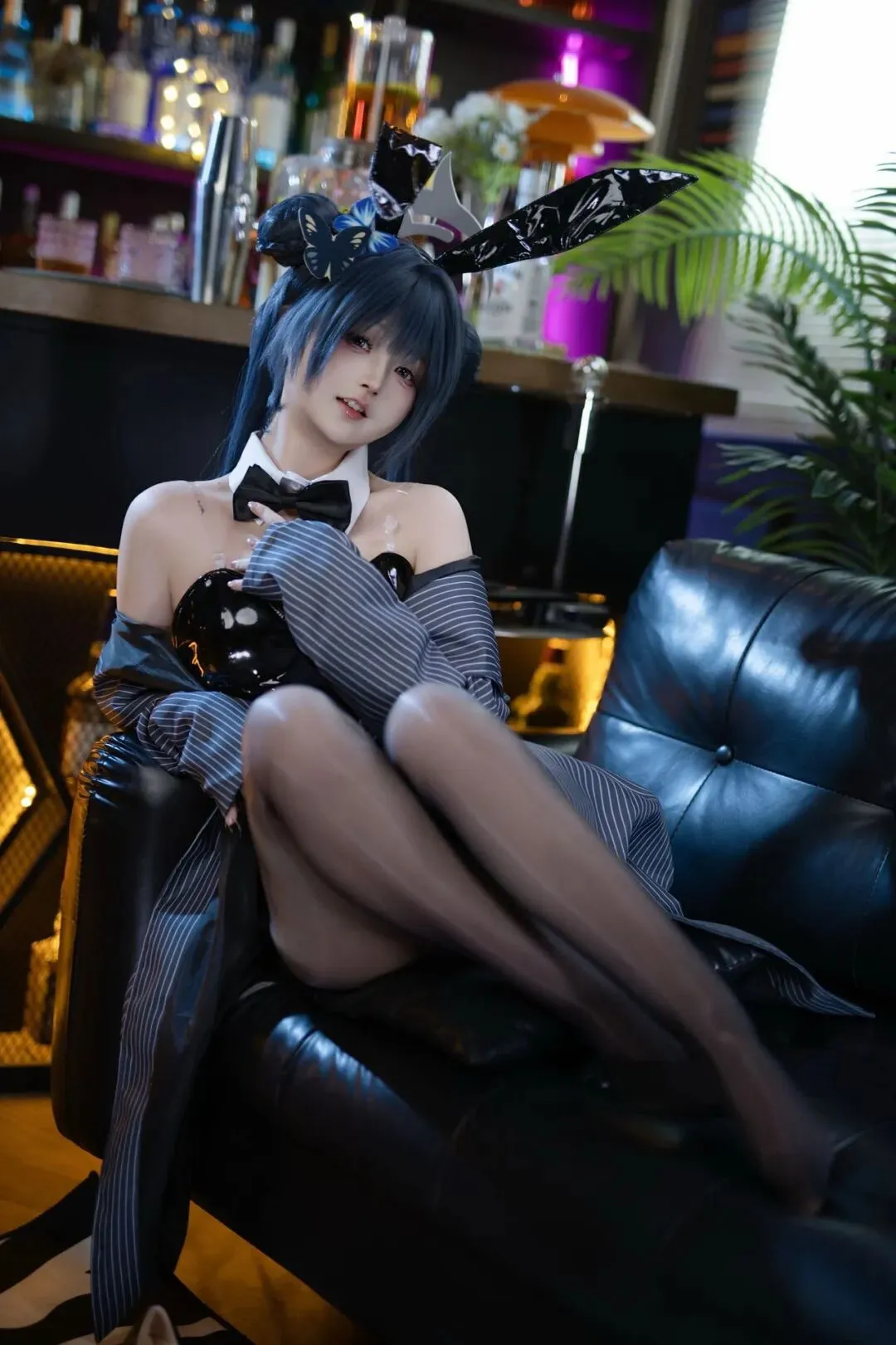 当城市的霓虹开始在玻璃上流淌,当酒吧的调酒器碰撞出清脆声响,当晚风吹散白日里的燥热与疲惫,一位来自《蔚蓝档案》的少女悄然落座,她就是龙华妃咲,以一身兔女郎造型打破了次元壁,将游戏里的清冷与现实中的性感完美融合,在光影交错间勾勒出独属于她的氛围感。在这组写真里,她没有刻意迎合大众对兔女郎的刻板印象,没有用夸张的姿态博人眼球,而是用细腻的神态和松弛的肢体语言,诠释出角色独有的反差感,黑色亮面紧身衣勾勒出流畅的曲线,条纹西装外套随意搭在肩头,既带着几分随性的慵懒,又藏着不经意的利落,黑色蝴蝶结系在颈间,衬得她的脖颈愈发纤细,既带着少女的娇俏,又藏着一丝成熟的魅惑,每一处细节都在诉说着coser对角色的深刻理解,也让龙华妃咲这个名字,在现实的光影里有了更鲜活的模样。