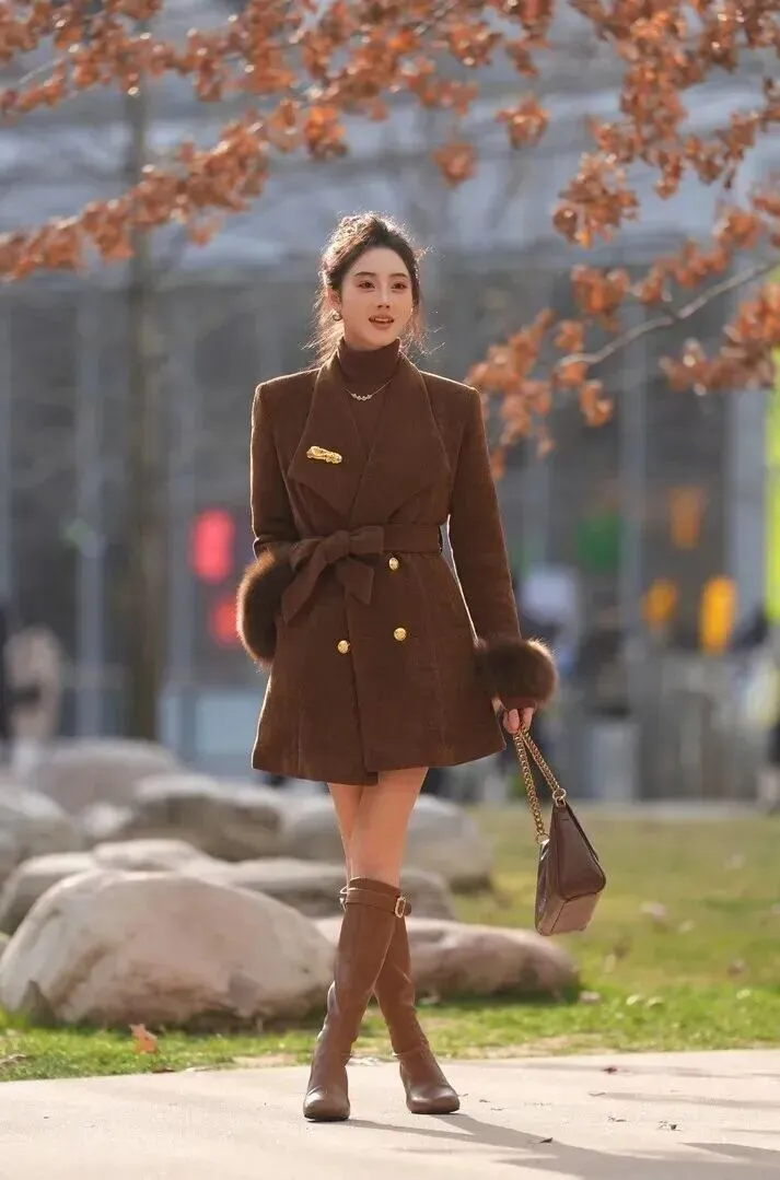 接下.来这套适.合约会.或者.见家长。.短款毛呢.外套特别显.高,小个.子姐妹放.心冲。腰带.给系.上,立.马就有腰.了。我超.爱袖子那.圈的.毛毛.,每次抬.手都觉.得自己.在演民国.剧。里.面配个深棕.色高领衫.,暖和又显.气质。靴子.选和内搭.同色的,腿.长瞬间.拉长十公分.。拎个.皮质.小包.,温柔得.都能掐.出水来.