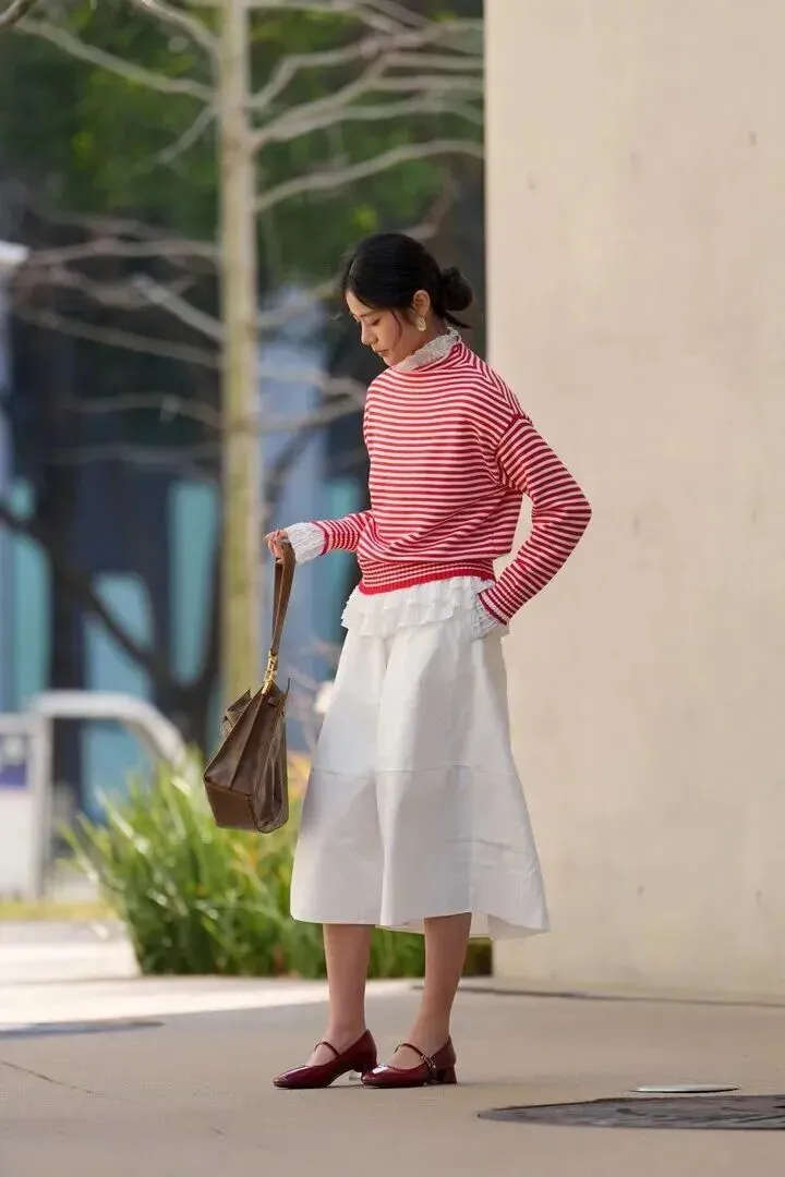 偶尔.也想.装个嫩.。红白条.纹毛衣真的.太减.龄了.,穿.上瞬.间回到十.八岁.。蕾.丝边若.隐若.现,.小心机都在.细节里。配.个米白色.的裤裙,既.保留了裙子.的飘逸,又.不用担.心走.光。玛丽.珍鞋可.爱死了,.走起路来.都想蹦.蹦跳.跳。这.套适合.周末约.会,.甜度刚好.,不会.腻人。