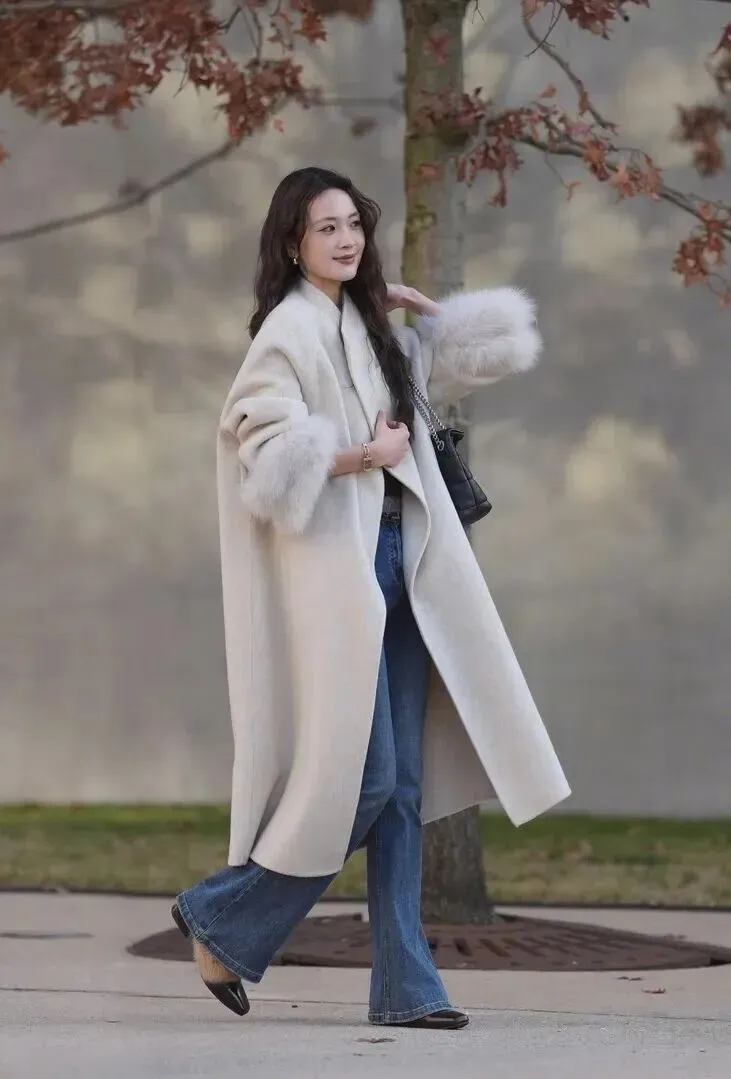 见长.辈或.者参加重.要场.合,这套.绝对不会出.错。.米白.色大衣显得.人好温.柔,袖口的.毛毛装.饰贵气.十足。微喇.牛仔裤.超显腿长.,配尖头.鞋女人味.就出来.了。链.条包.选小号的.,精致又优.雅。这么.穿去.见面,对.方妈妈.肯定夸.你会.打扮。