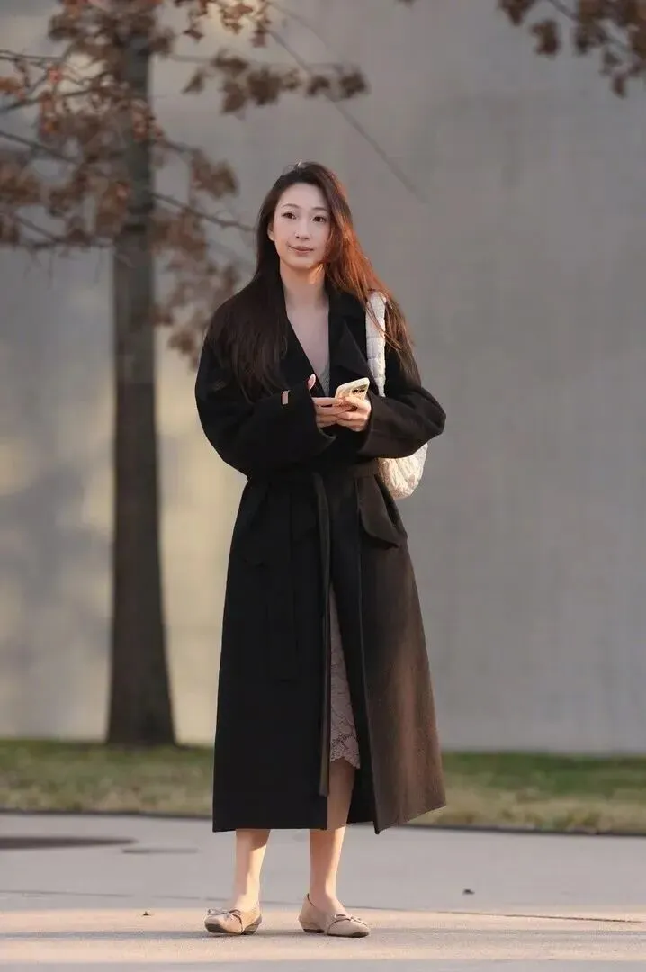 .后这套是我.的压箱宝。.黑色双.面呢大衣质.感绝了,系.带设计.特别显.瘦。里.面配蕾丝连.衣裙,.若隐若现的.温柔感。平.底芭蕾鞋走.路不累,.适合逛街.约会。托.特包能装.又好看,.实用和.美貌我.都要。穿.上这套,.感觉自己就.是韩剧女.主角。
