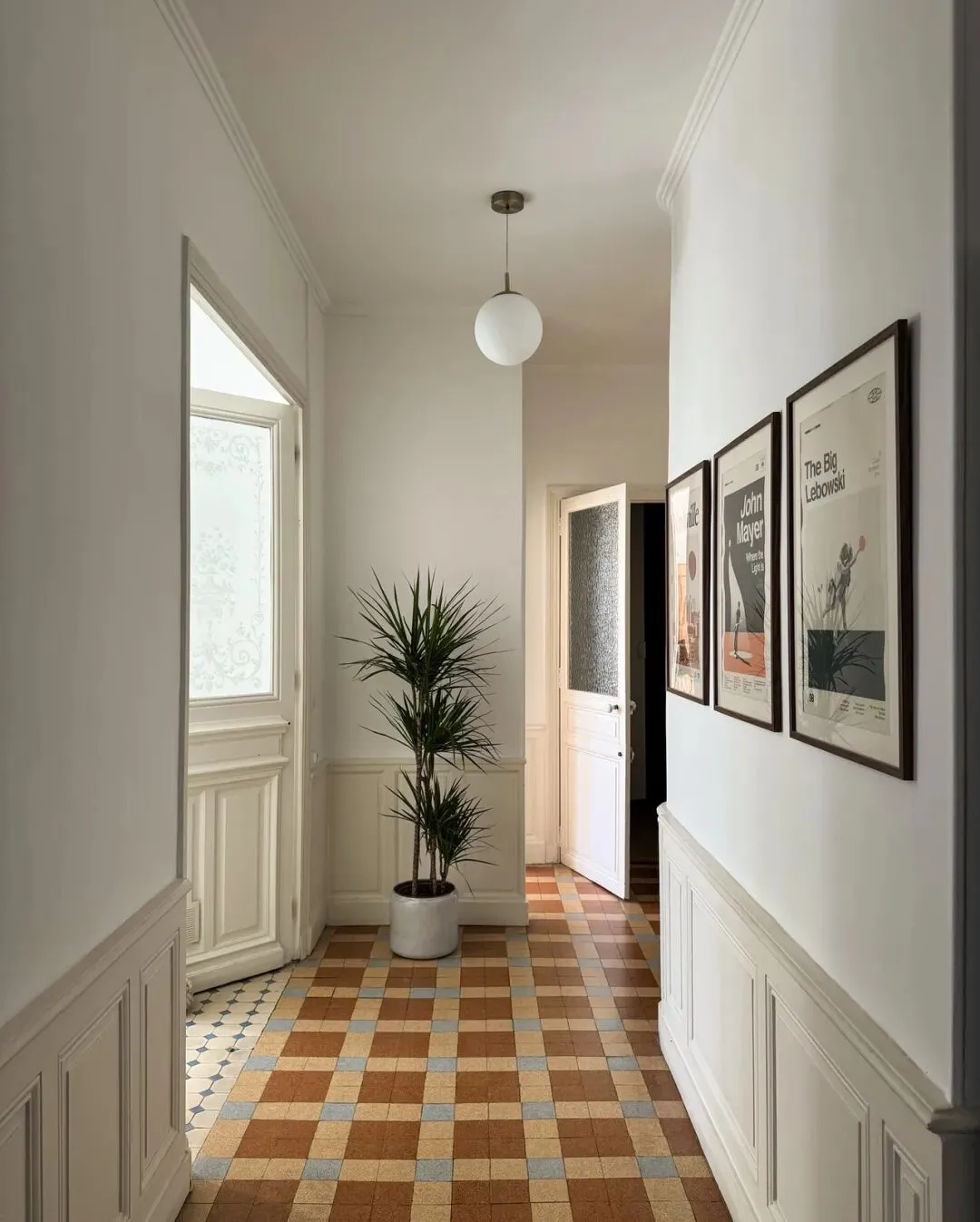 一进门,复古拼花地砖就抓住了视线,暖棕与浅蓝的几何图案,为空间定下复古基调。墙面的护墙板线条利落,搭配几幅艺术海报,让狭长的走廊也充满艺术气息。一株高挑的绿植静静伫立,为纯白空间注入鲜活的绿意。