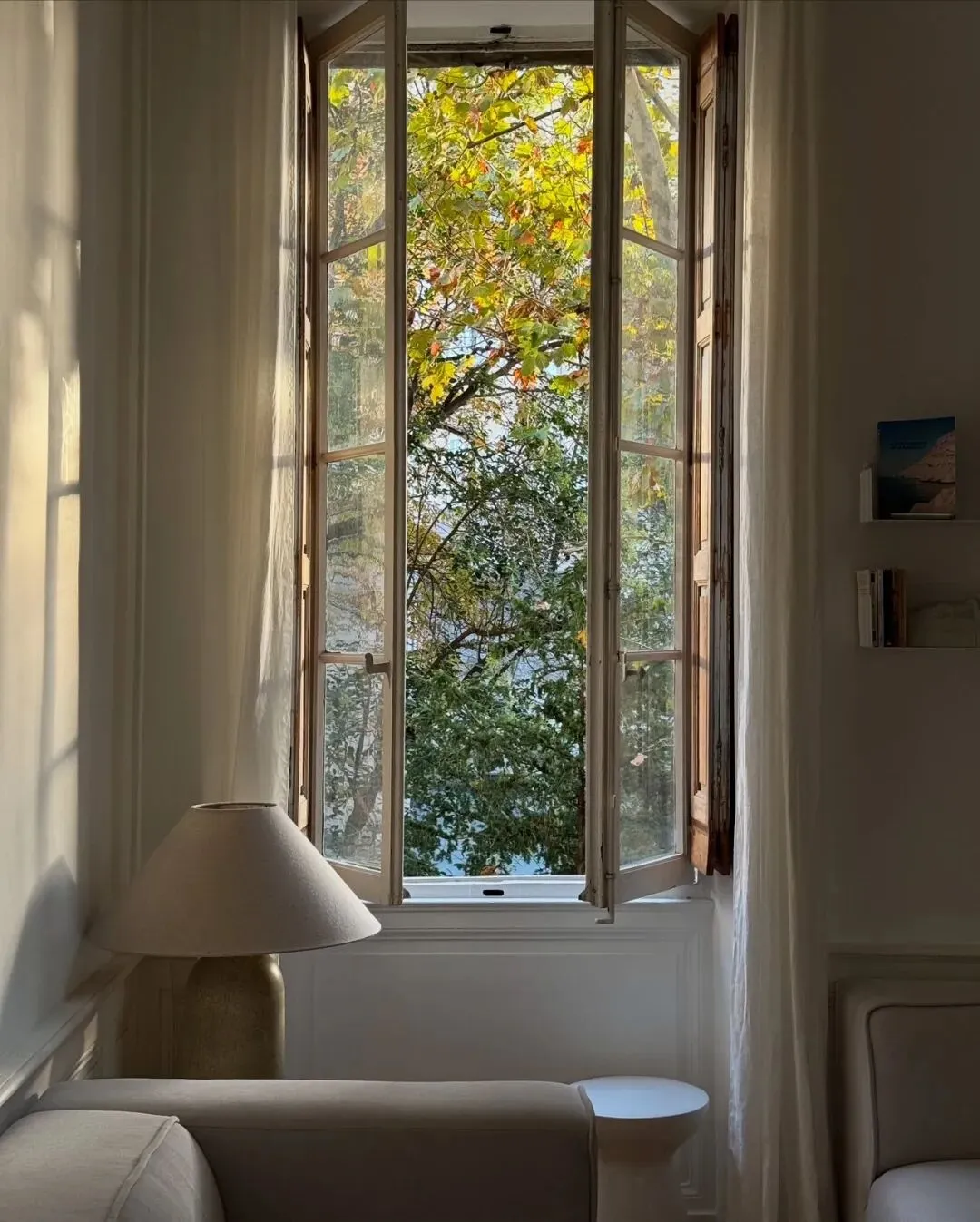 大面的木质百叶窗被完全打开,充沛的自然光倾泻而入,在地板和墙面上投下斑驳的光影。窗外的葱郁树木与远处的马赛老城,被框成了一幅流动的风景画,让室内与自然无缝衔接。