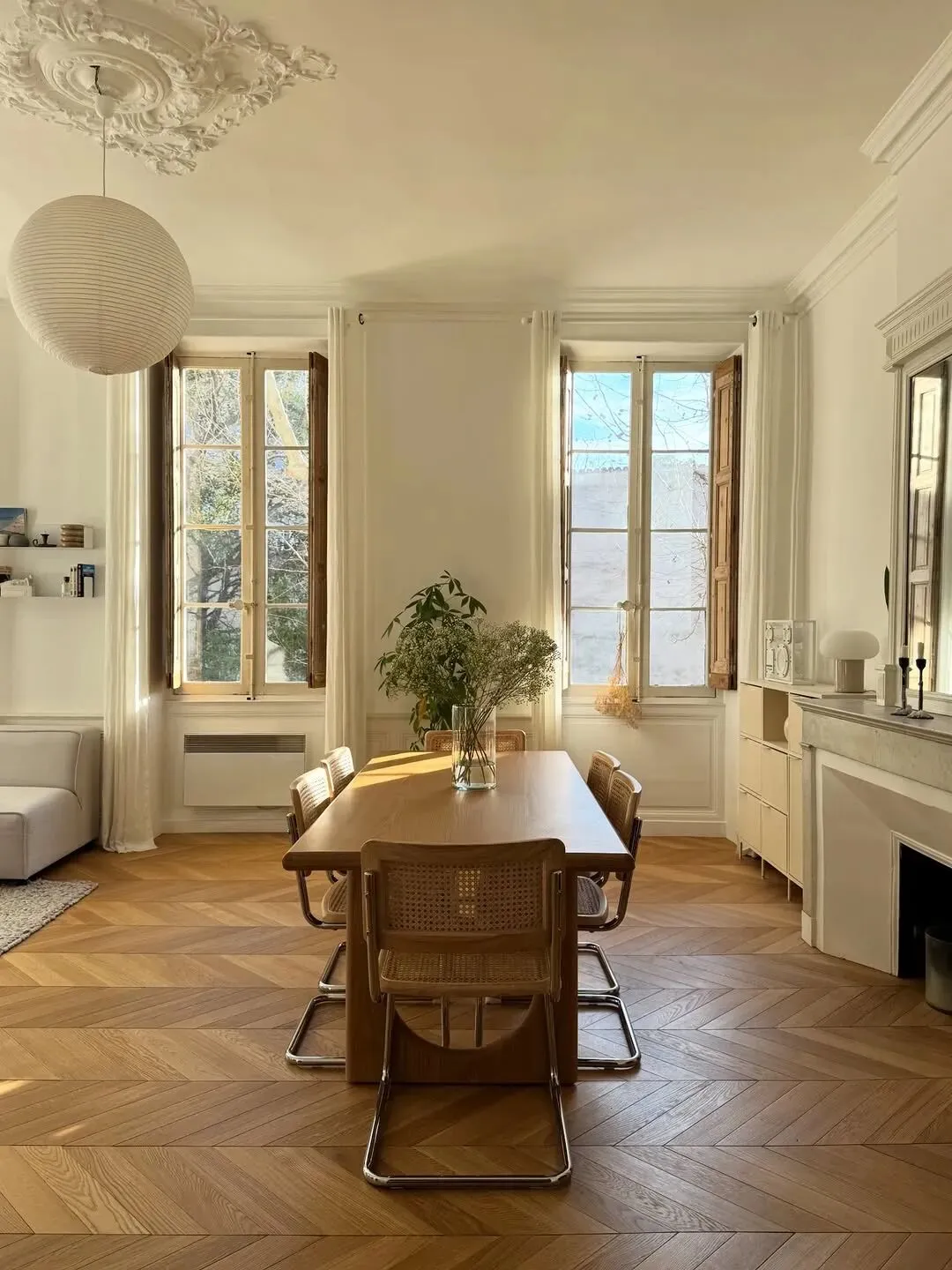 客厅是整个家的灵魂所在。挑高的天花板上,精致的石膏雕花与巨大的白色纸灯相映成趣,复古又轻盈。浅灰色的模块化沙发,搭配木质茶几与藤编餐椅,线条简洁却充满质感。
