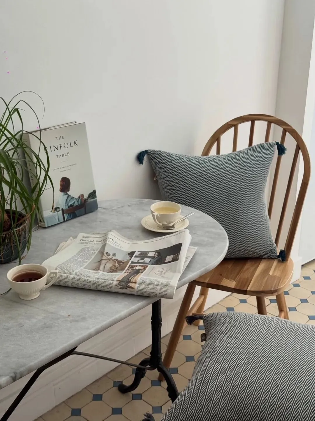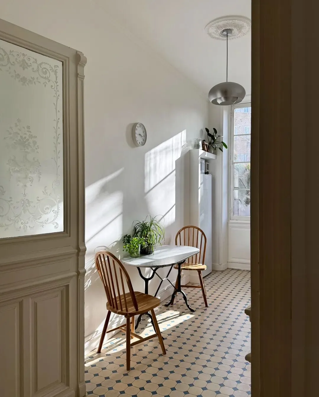 另一处用餐区则更显温馨,大理石台面的小餐桌搭配温莎椅,蓝白相间的花砖地面,与窗外的街景相映,是享受早餐或下午茶的绝佳角落。
