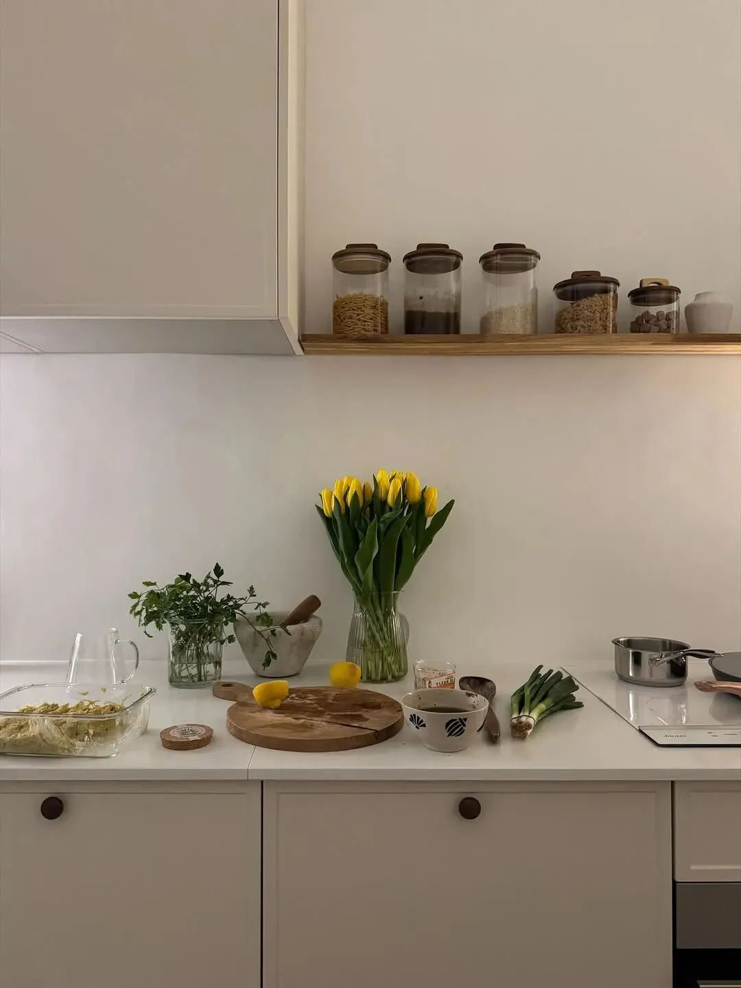 厨房延续了整体的简约风格,白色橱柜与木质搁板相得益彰。台面上的新鲜郁金香、香草与食材,让日常的烹饪也充满仪式感。