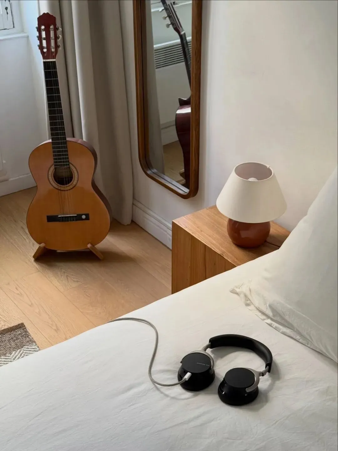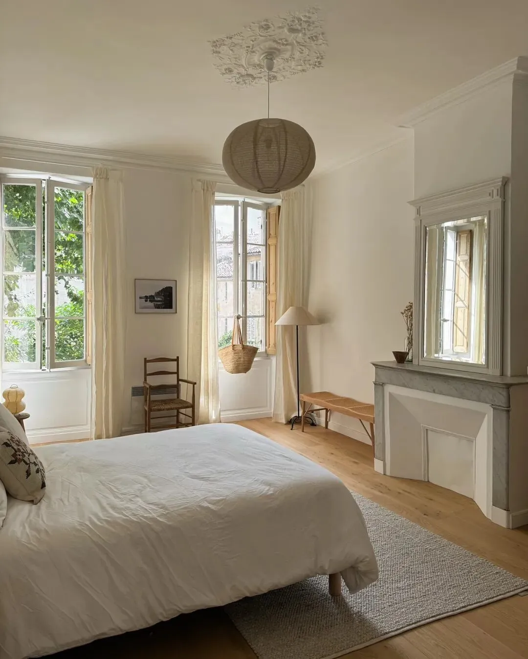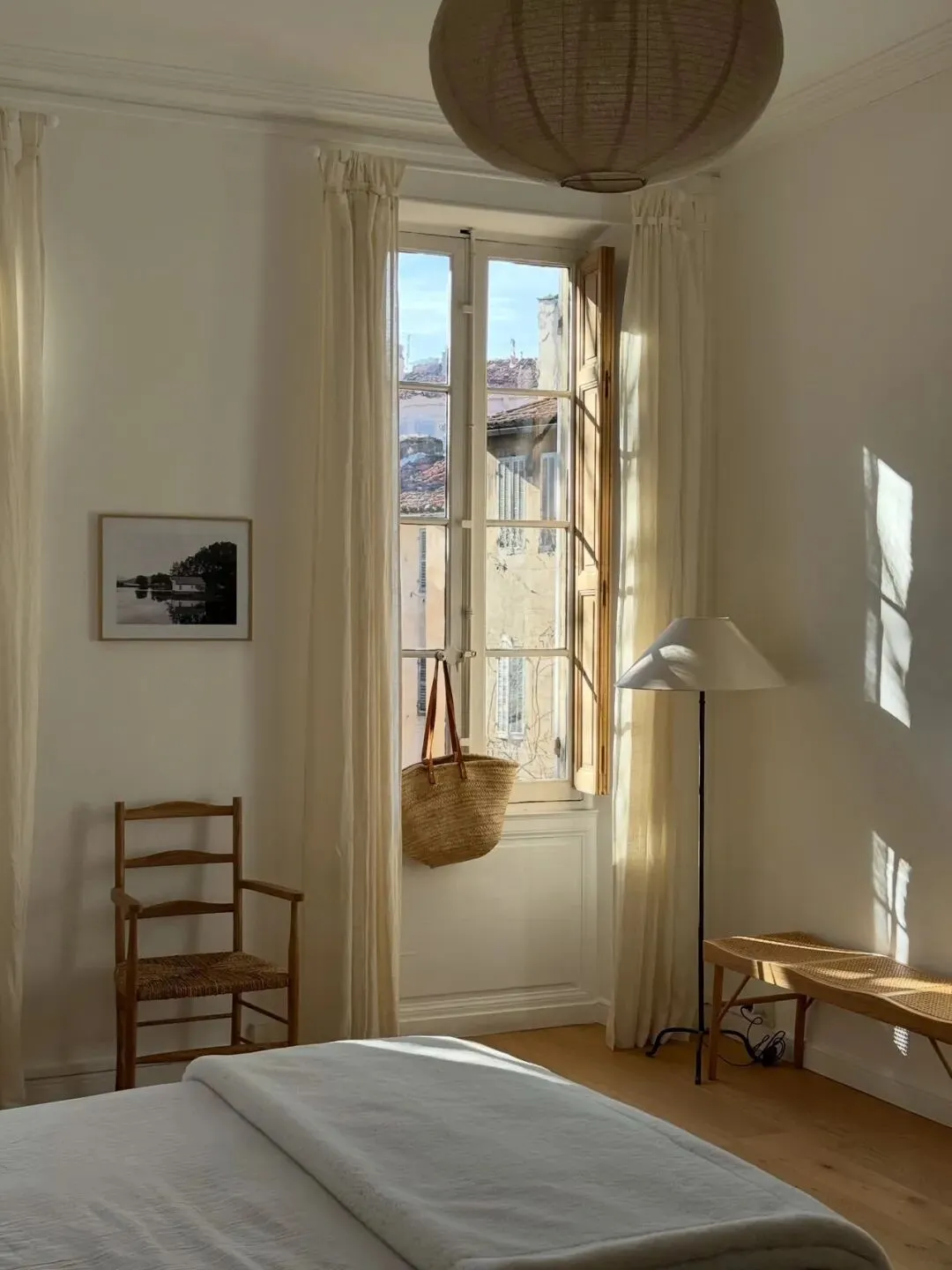 卧室是让人彻底放松的空间。纯白的床品与浅木色地板,搭配柔和的光线,营造出宁静的氛围。藤编床头板、木质长凳与编织篮,每一件单品都充满了自然的温度。