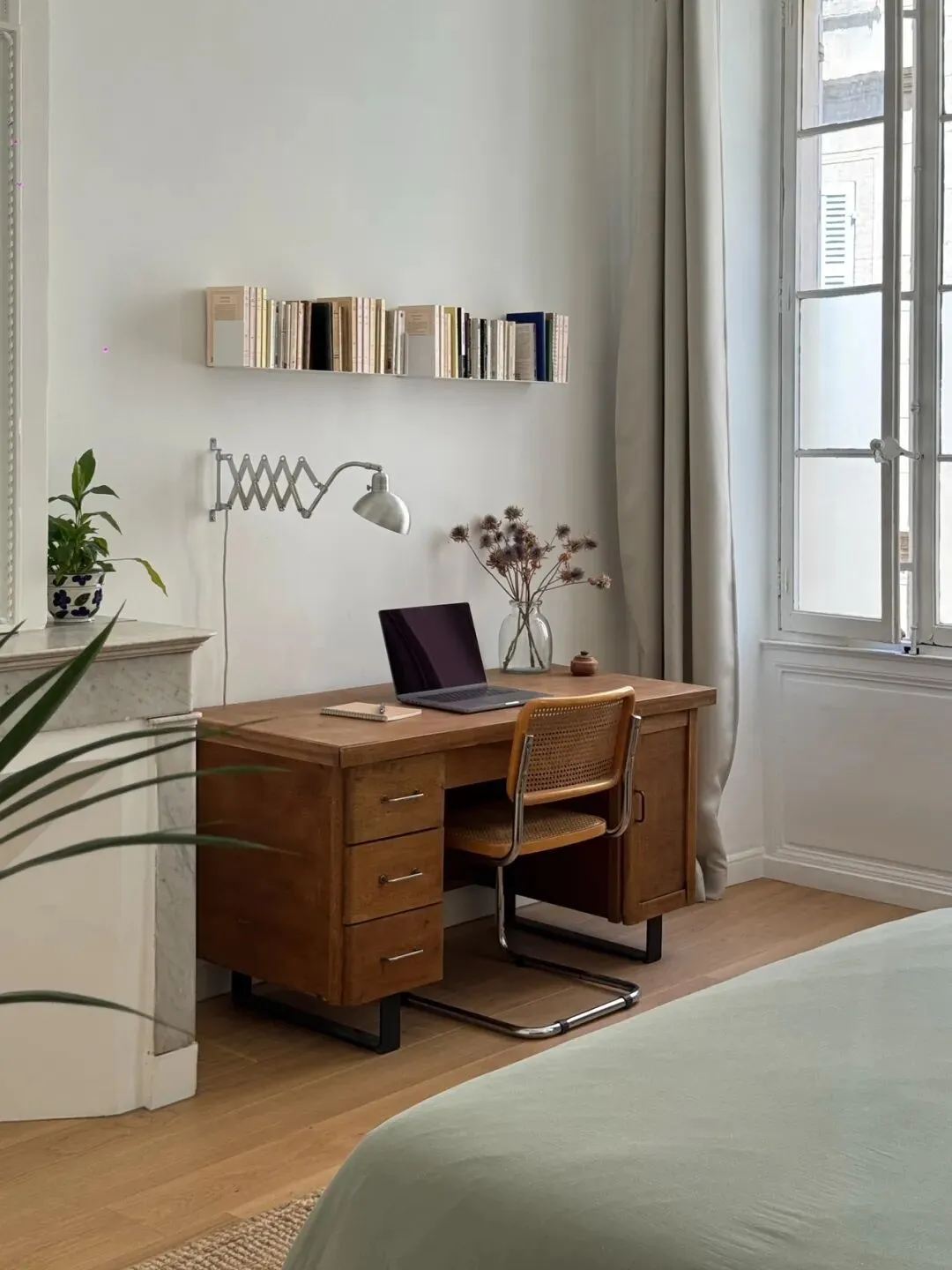窗边的中古书桌,是屋主的工作角落。木质抽屉柜与藤编椅,搭配可调节的金属台灯,在复古与实用之间找到了完美平衡。