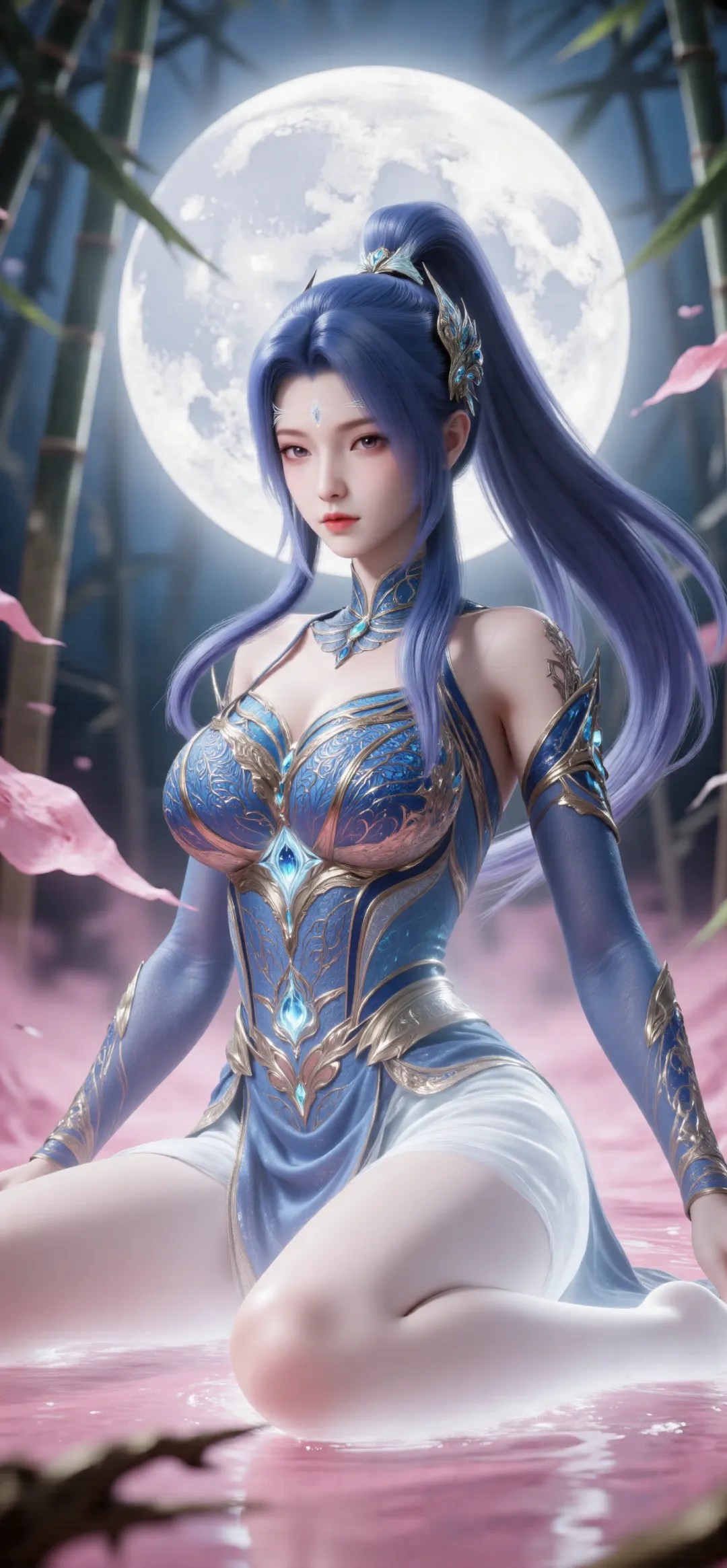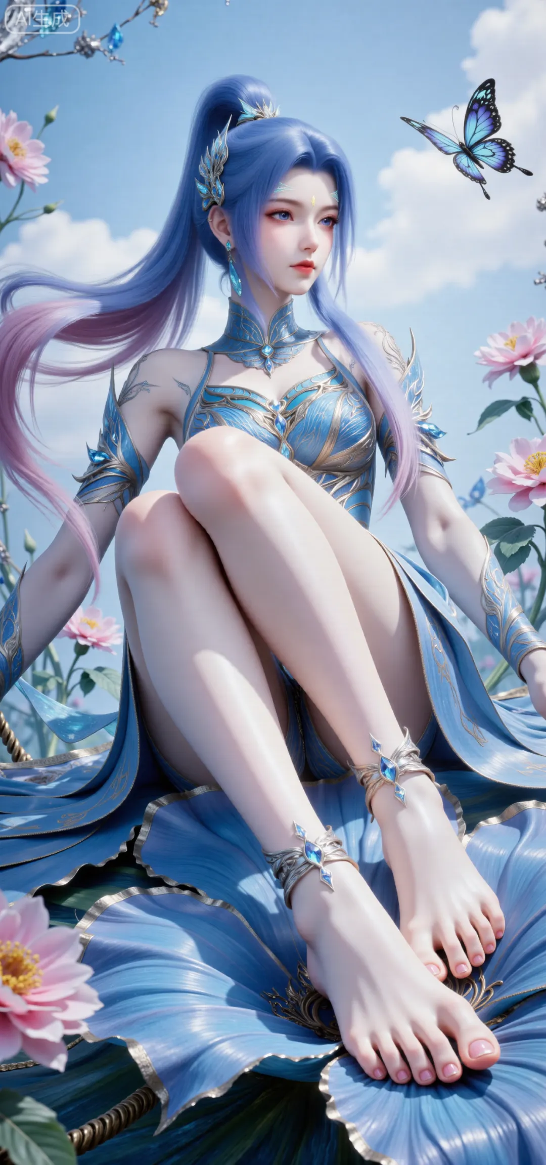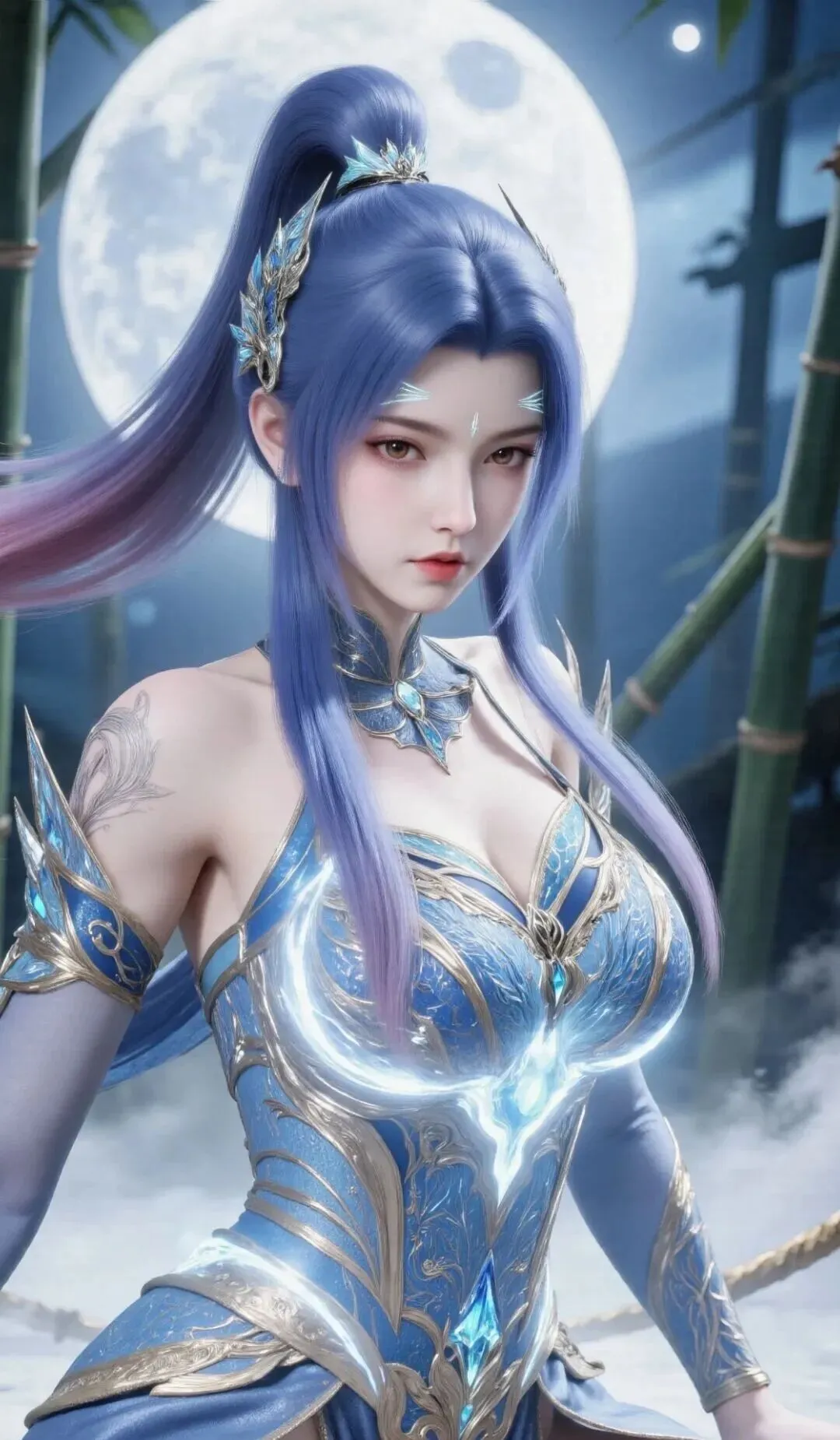 换回女装、恢复唐舞桐本貌后,她的容颜彻底褪去了少年的英气,绽放出令人惊艳的绝世风华。身形愈发高挑纤细,娇躯修长,肩背挺直如松,行走时身姿优雅如蝶舞,自带神圣不可侵犯的气场,却又不失少女的轻盈灵动。一头粉蓝色长发如瀑般垂至腰际,发丝柔顺亮泽,偶尔会泛着银蓝渐变的光泽,发尾晕染着淡淡的金光,随风飘动时宛如月华流转,美得不可方物。她的眉眼生得极美,黛眉弯弯如新月,不描而翠,眉尾微微上翘,添了几分娇俏,却又因神界贵女的身份,多了几分清冷疏离;长而卷翘的睫毛,粉蓝色的眼睫纤长浓密,眨眼间如蝶翼轻振,灵动动人;眼眸依旧是标志性的粉蓝色,澄澈通透,比男装时期更多了几分柔美与深情,平静时温润如紫玉,动怒时泛着冷冽的光泽,看向霍雨浩时,眼底盛满了化不开的眷恋与温柔,那是历经生死后,最纯粹也最坚定的深情。