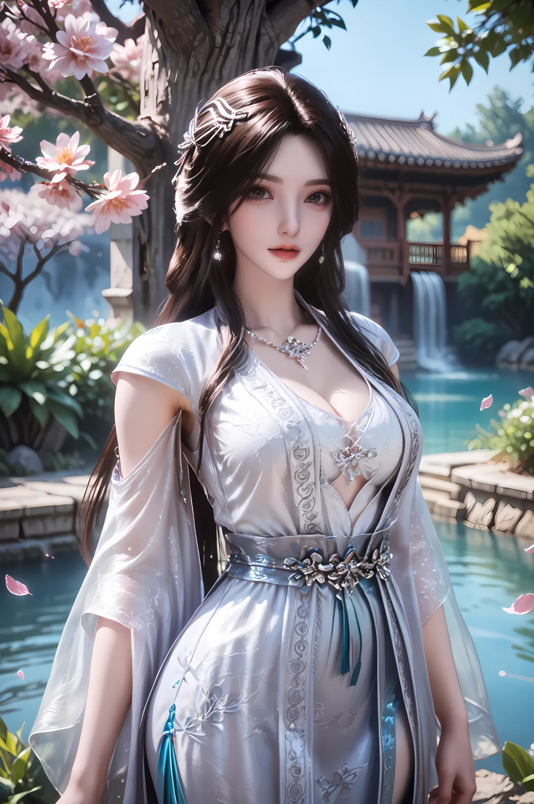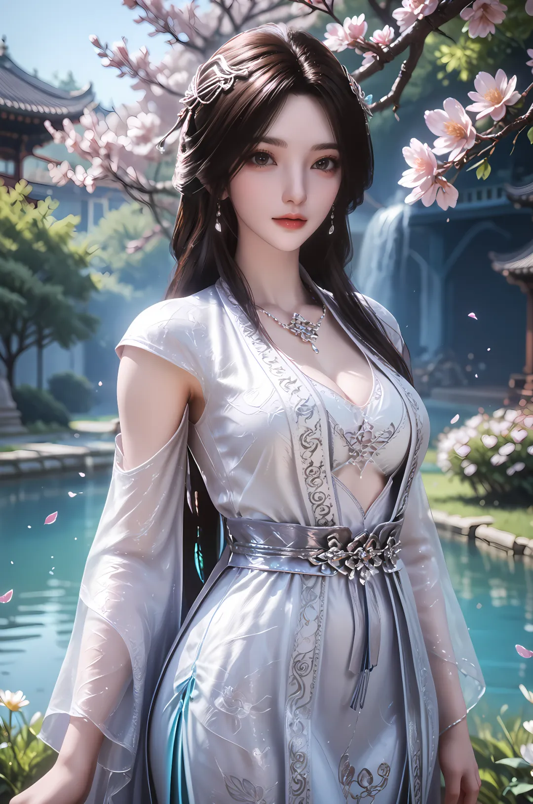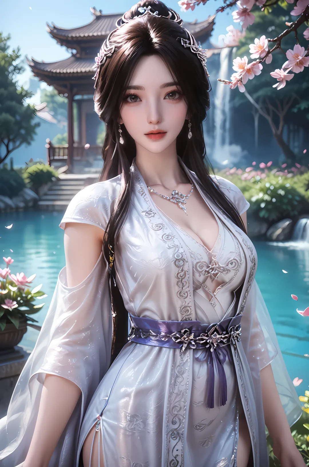 少女时期的雨馨,居于雁荡山中,未经世事,心性纯真,衣着也尽显素雅清新,不施粉黛,不穿华服,唯有一身简约的素色衣裙,贴合她纯粹善良的本心。彼时的她,常着一袭月白色或淡青色的襦裙,衣料是最朴素的棉麻,质地轻盈柔软,裙摆绣着淡淡的兰草或梅花纹样,简约而不单调,素雅而不失雅致,裙摆随风轻扬,宛若月下精灵,不染半分尘俗。腰间系着一根细细的素色丝带,不佩戴任何金银珠宝,唯有偶尔在发间插一朵新鲜的野花,或是系一根简单的玉簪,衬得她愈发清丽脱俗,纯真动人。赤着脚蹚水时,素色衣裙被溪水打湿,紧紧贴合着窈窕的身形,添了几分娇憨与灵动,那份未经雕琢的自然之美,让人一见倾心。