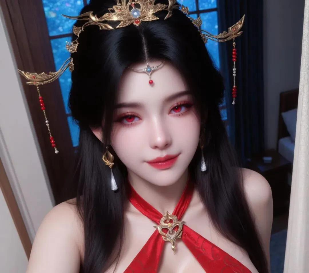 她的脸庞是标准的鹅蛋脸,轮廓柔和却不失棱角,下颌线清晰紧致,透着一股不容侵犯的凛然之气,却又因年少娇憨,添了几分圆润柔和,中和了血族的冷冽。眉眼是她容颜中最惊艳的点睛之笔,黛眉细长而锋利,眉尾微微上挑,似剑刃般透着锋芒,恰如她骄纵自负的性子,不将世间万物放在眼里;眉峰微蹙时,自带几分疏离与傲气,仿佛世间一切都入不了她的眼。眼眸是血族标志性的深红色,深邃如渊,澄澈却又带着致命的魅惑,瞳孔转动间,流光溢彩,既有少女的灵动娇憨,又有血族至尊的冷艳威严;开心时,眼底的红韵柔和,似盛满了温热的血玉,灵动动人;动怒时,眼底红芒暴涨,冷冽刺骨,透着杀伐之气,让人不寒而栗;算计他人时,眼底藏着狡黠与轻视,仿佛一切都在她的掌控之中。