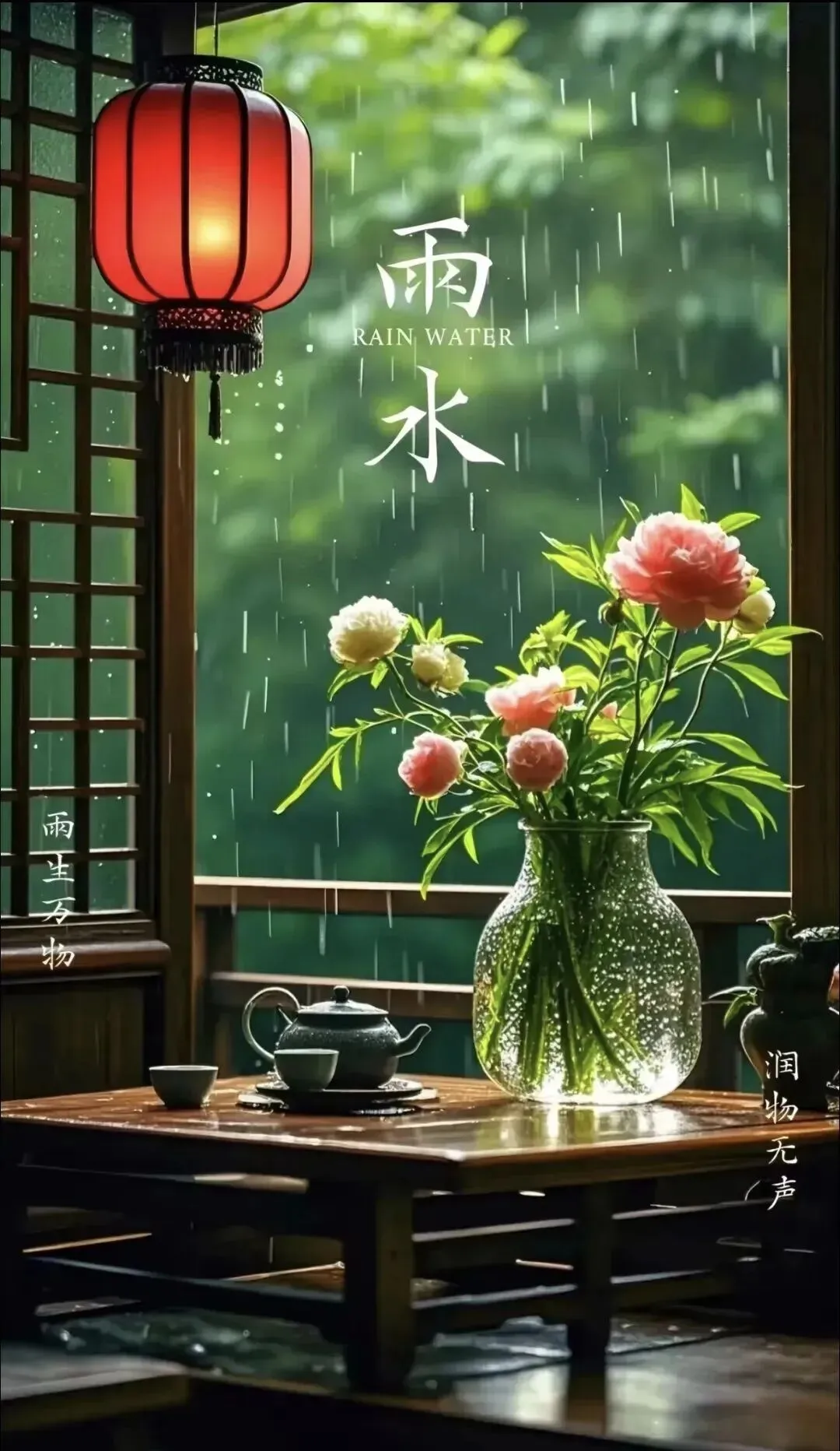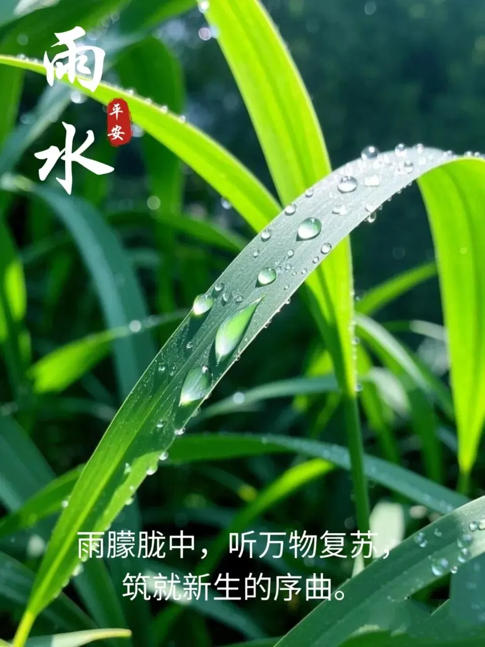 4. 细雨濛濛,春意渐浓🌧️。“雨水草萌芽,惊蛰虫出土”,大地苏醒,草木萌新🌱。好雨知时节,当春乃发生,愿雨水洗尽尘埃,带来清新与希望,心情舒畅,身体康健,家庭和睦,万事皆可期🌟。