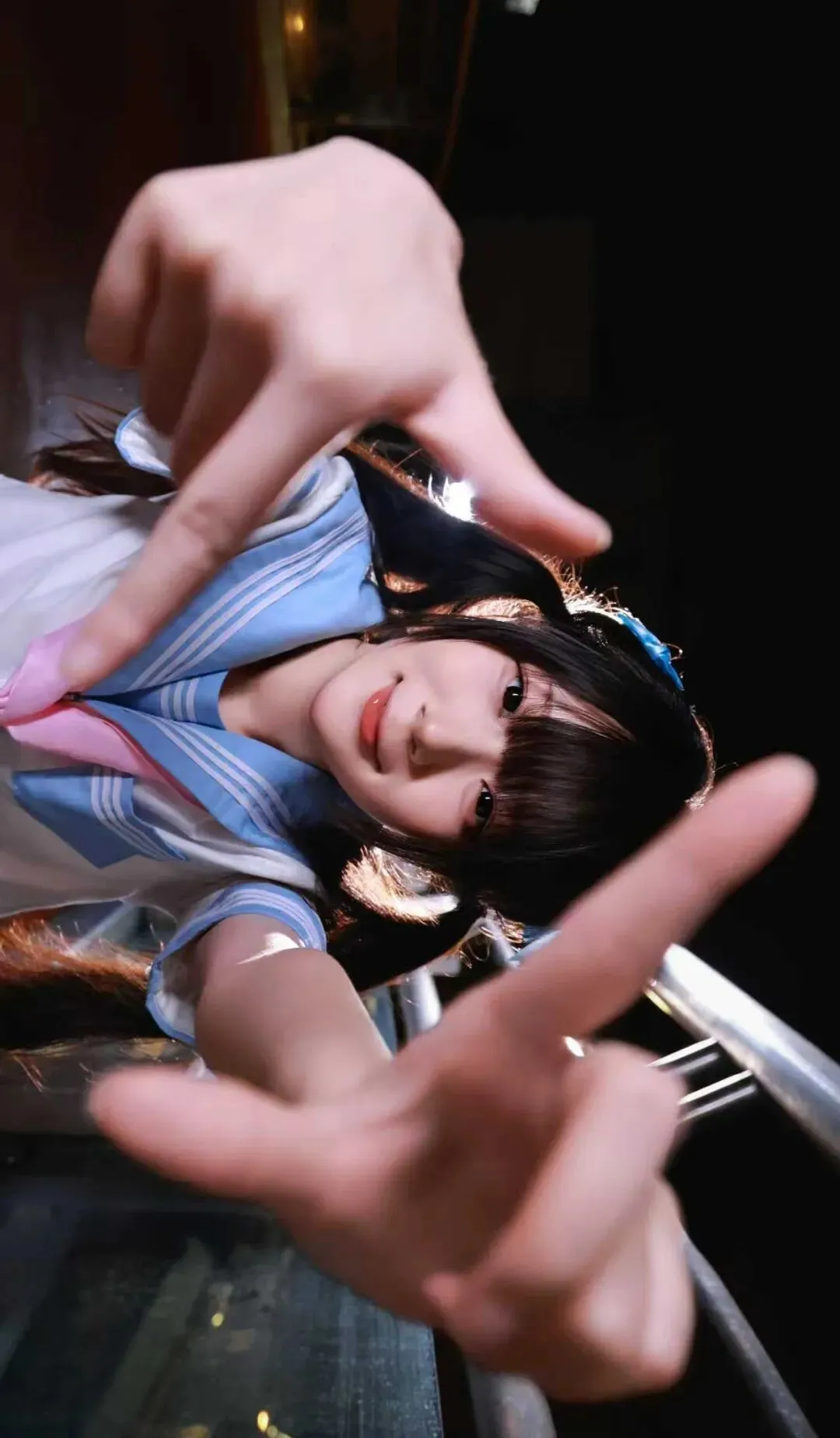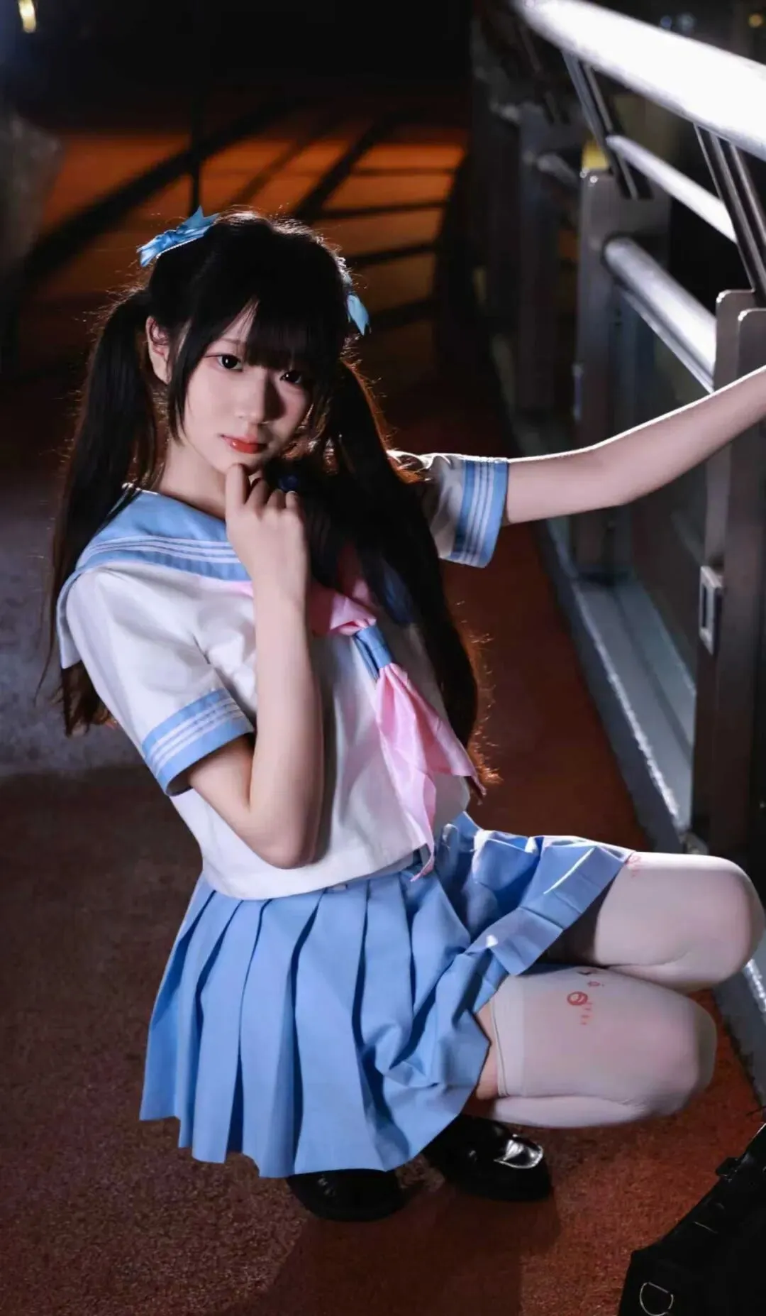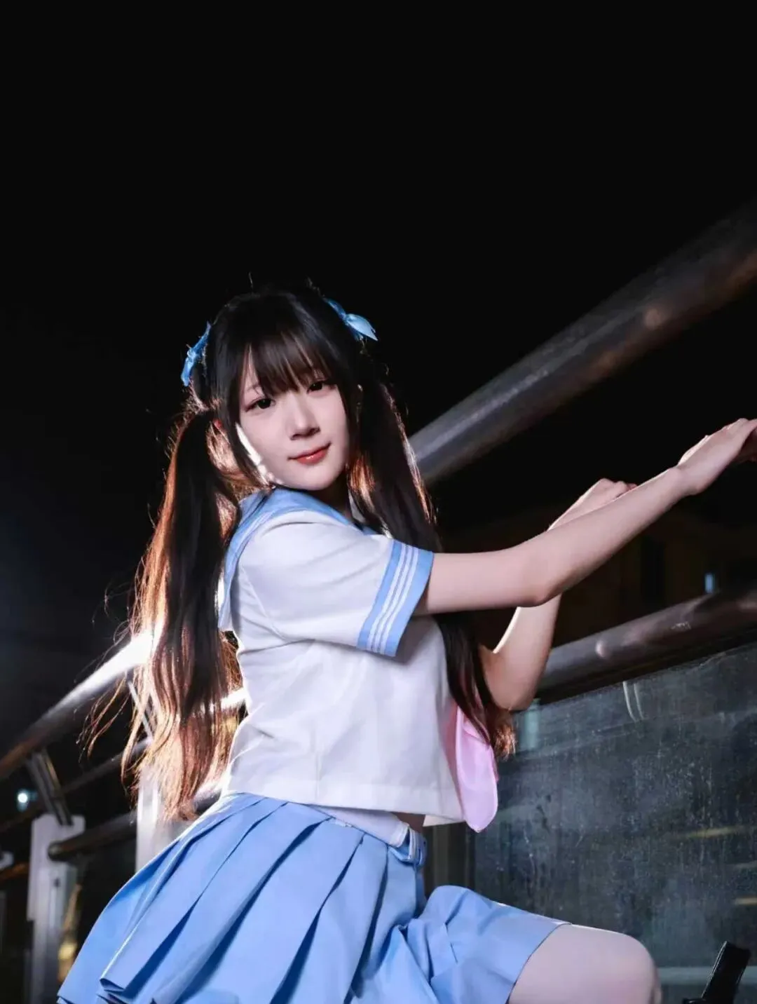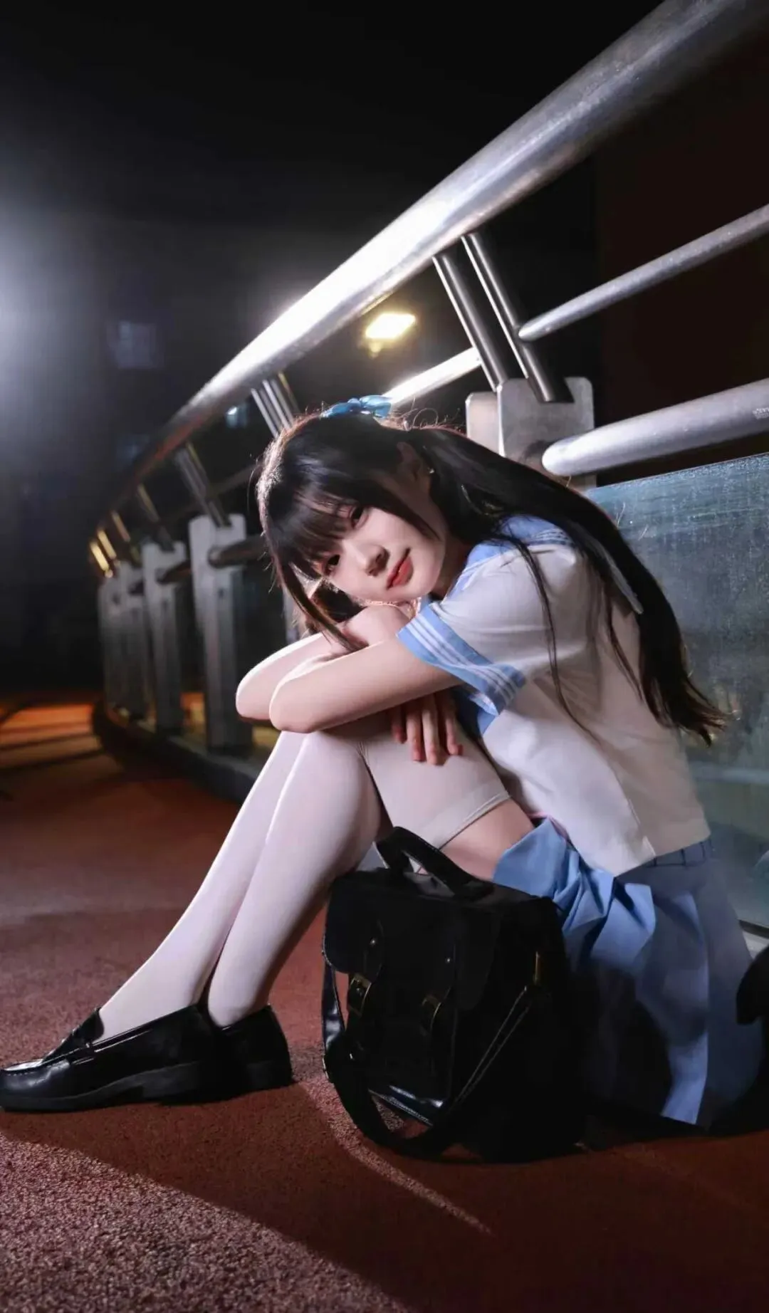 在城市的喧嚣渐渐沉寂的夜晚,一盏孤灯照亮了桥上的方寸之地。一位身着水手服的少女,蜷坐在桥边的角落,仿佛与这静谧的夜色融为一体,周身萦绕着一种孤独而又神秘的气息,让人忍不住想要探寻她内心的世界。少女身穿经典的白蓝水手服,白色的上衣纯净如雪,蓝色的领口和袖口如同深邃的海洋,给人一种清新而又宁静的感觉。短裙的蓝色与上衣相呼应,在灯光下泛着柔和的光泽。她穿着白色的长筒袜,双腿优雅地蜷曲着,脚上是黑色的皮鞋,简约而又大方。身旁放着一个黑色的手提包,质感厚实,仿佛承载着许多不为人知的故事。她的长发如黑色的绸缎般披散在肩头,发间别着一个蓝色的发饰,增添了几分俏皮与可爱。然而,她的表情却与这可爱的装扮形成鲜明的对比。她将下巴轻轻地搁在膝盖上,眼神空洞地望向远方,似乎在沉思,又似乎在等待。那眼神中,透露出一丝迷茫、一丝忧伤,还有一丝不易察觉的倔强。
