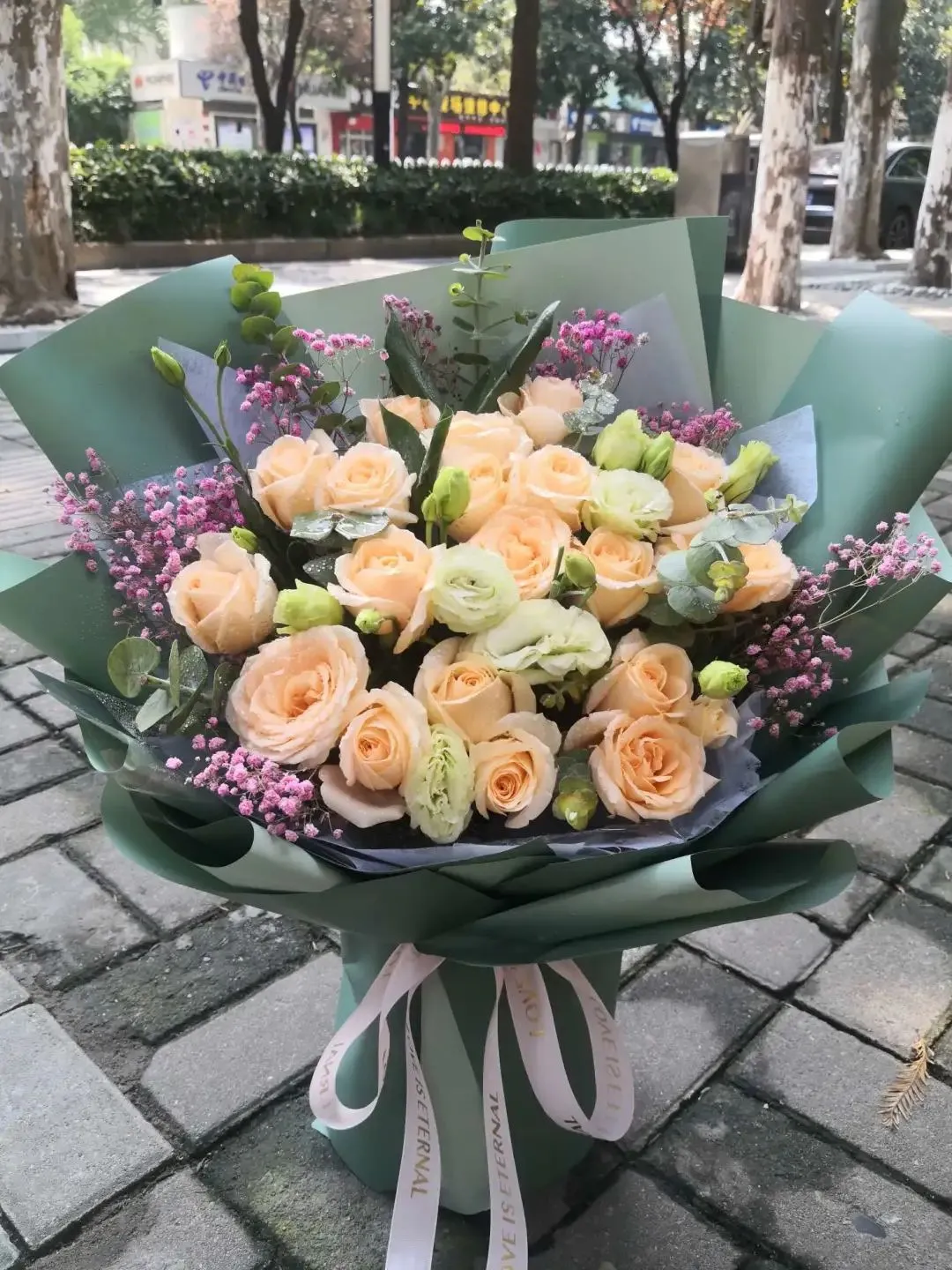 晴空灿烂-香槟玫瑰11枝,白色洋桔梗5枝