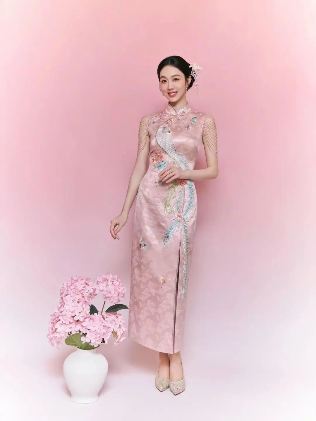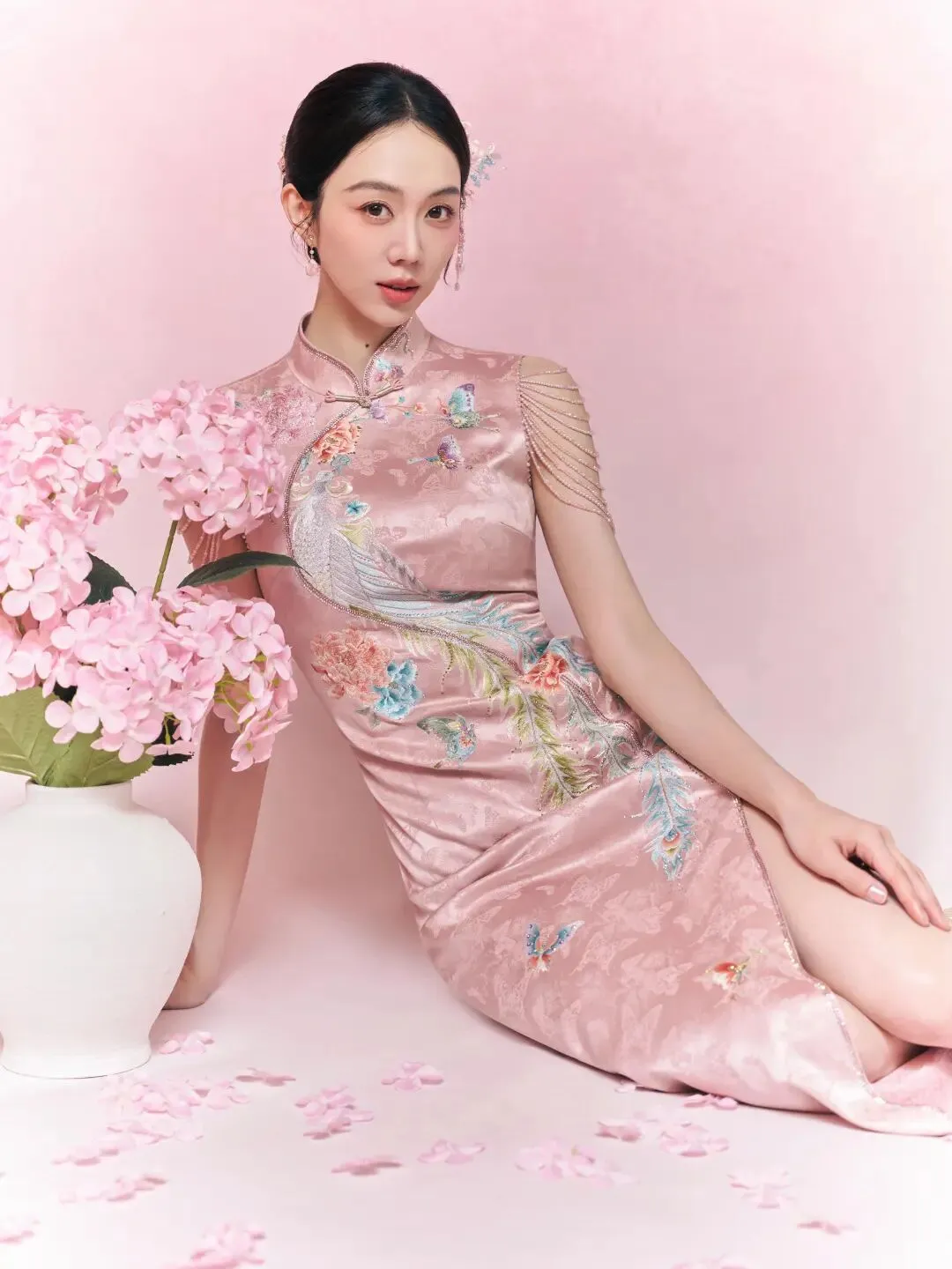 这袭旗袍,是传统与现代的精妙融合。柔粉的缎面底色,如春日初绽的桃花,带着几分娇俏与温婉,却又因面料的光泽感,添了几分贵气。最动人的,是旗袍上的刺绣——一只彩羽凤凰自下摆扶摇而上,尾羽如流光溢彩的丝线,从腰侧蜿蜒至肩头,青蓝、朱红、明黄的丝线交织,每一根羽毛都似在轻轻颤动,仿佛下一秒便要振翅高飞。凤凰身旁,是盛放的牡丹与翩跹的彩蝶,针脚细密,色彩鲜活,将“花开富贵”“蝶舞蹁跹”的美好寓意,藏于一针一线之间。