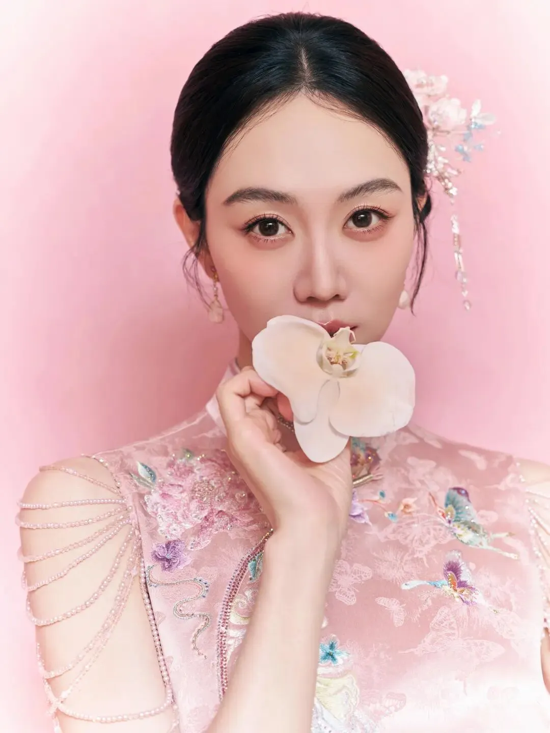 背景的布置,更是为这份东方韵致添了几分意境。柔粉的墙面,如同一幅晕染开的宣纸,将旗袍的色彩衬得愈发柔和;一旁的白色瓷瓶里,插着几枝盛放的绣球花,粉白的花瓣层层叠叠,与旗袍的色彩相得益彰,地上散落的花瓣,似是春风拂过,吹落了一地温柔,让整个画面,都氤氲在一片浪漫而诗意的氛围里。深色的木椅,与柔粉的色调形成鲜明对比,既稳住了画面的重心,又让这份柔美中,多了几分沉稳与厚重。