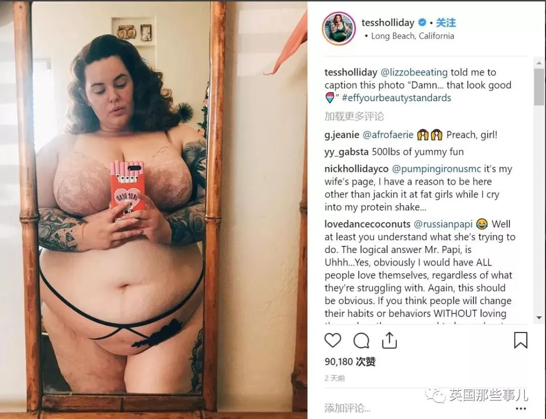 Instagram的留言里,绝大多数都是在赞美Tess的美和自在的态度。