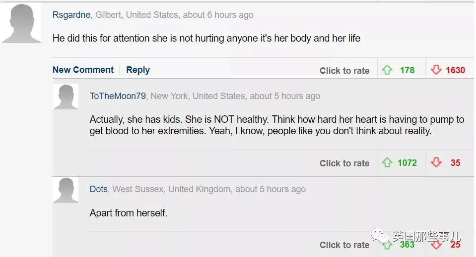 回复:“实际上,她有孩子。她是不健康的!想想她的心脏为了给全身供血要承受多大的负担!”