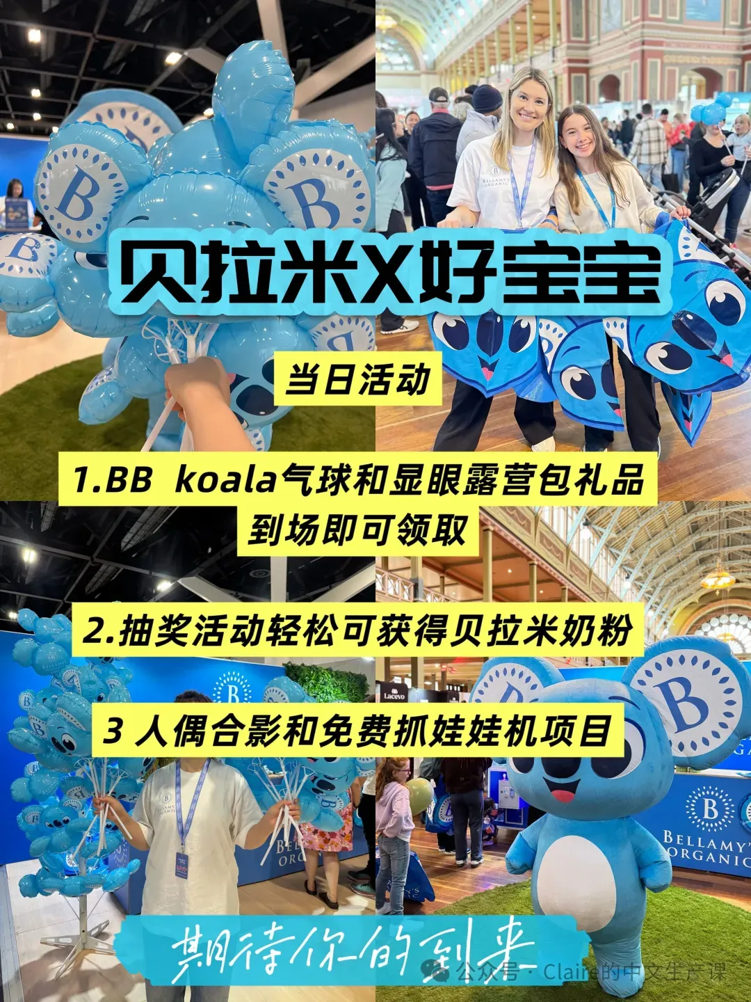 🎈贝拉米Bellamy奶粉:天然有机,呵护宝宝第一口营养。澳大利亚畅销品牌加入好宝宝,为大家介绍贝拉米新设计辅食包和针对小宝宝肠胃设计的有机奶粉。参与抽奖即可轻松获得贝拉米奶粉(当天300罐随机抽奖),更可免费畅玩抓娃娃机和大型人偶互动,还能免费领取BB koala气球和显眼露营包,好礼享不停!