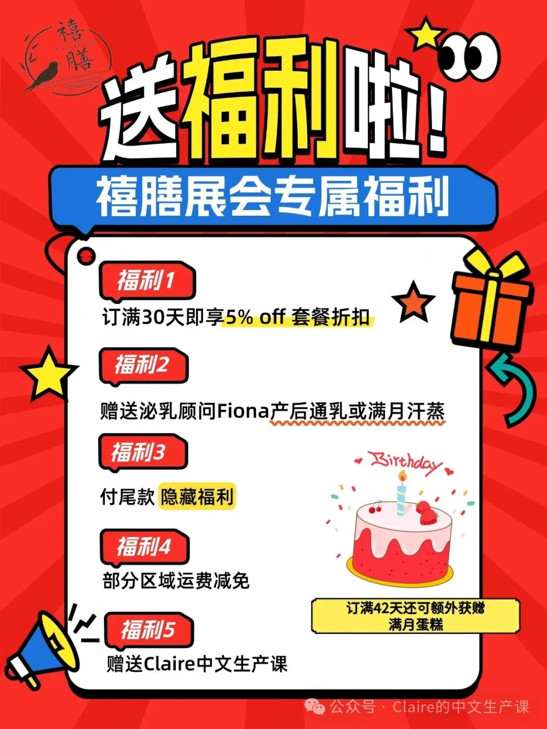 🎈禧膳墨尔本定制月子餐:营养均衡、口味丰富,分阶段温补细调专业搭配-助力产后恢复,让妈妈吃得安心又美味!当天优惠:(1)订满30天以上享受5%的套餐折扣;(2)赠送Claire的中文课程;(3)赠送泌乳顾问Fiona的产后通乳或满月汗蒸;(4)现金支付尾款额外减免$200;(5)部分区域运费减免;(6)订满42天送宝宝满月蛋糕一枚。