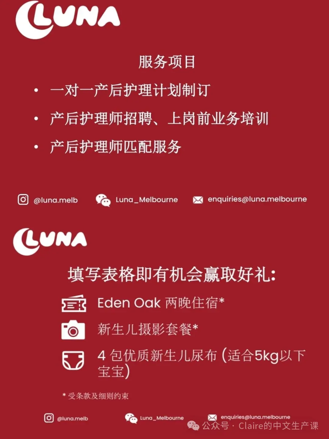 🈶 Luna中式产后母婴护理服务提供了300份中式泡脚包礼品包,和抽奖动。一等奖 Geelong 酒店免费两晚入住服务