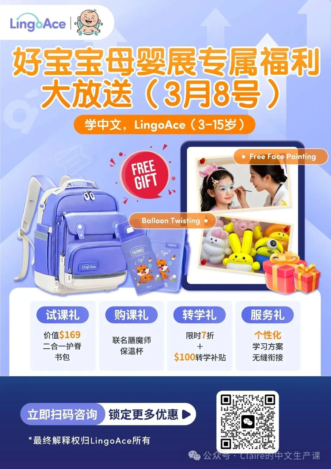 🎈LingoAce:专注儿童学习教育平台。免费脸部彩绘 + 精美气球免费领,参与免费试课即赠价值$169护脊书包,更有购课享7折,再送联名膳魔师保温杯,转课补贴$100,福利多多,不容错过!