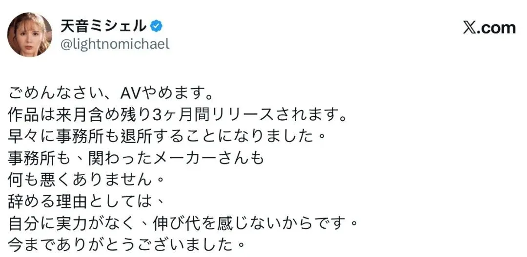 今天这消息来得也太突然了吧——大家熟悉的那个身高178的混血大美女天音蜜蜜(天音蜜雪儿),刚刚在X上发了个重磅炸弹:老娘要退圈了!她的退圈声明写得特别实在,我来给大家划重点哈:对不住各位啊,我决定不干了,也要离开现在的经纪公司。这事儿跟公司和片商都没关系。主要是我觉得自己能力不够,也看不到啥进步空间了。谢谢大家从出道到现在一直这么挺我。