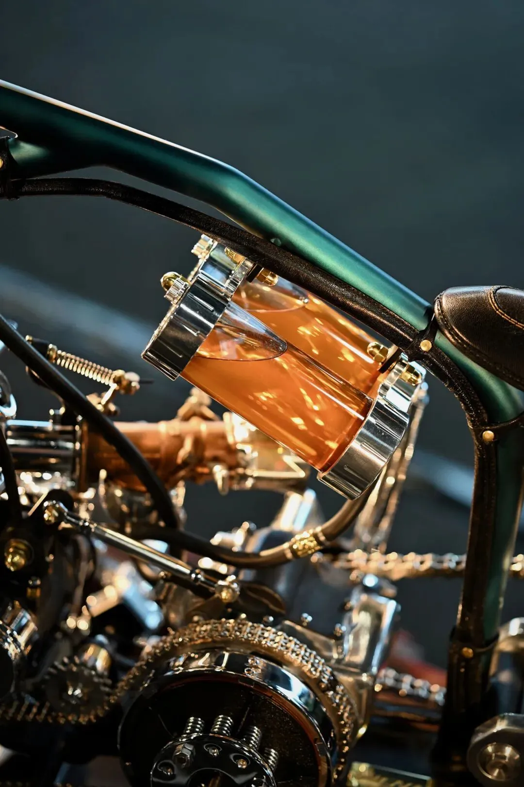 涂装同样讲究。金箔、墨绿色油性颜料、夜蓝渐层、黑色过渡、银叶细节,最后覆以柔雾清漆,层次丰富却不浮夸。整体更偏Art Deco竞赛车风,而非美式Hot Rod张扬路线。