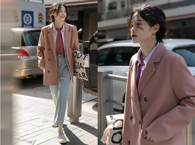 如果在大街上,看到黑、白、灰颜色的小西装,已经是司空见惯了。要想穿得小众化一些,可以考虑这样的西柚色小西装,中长款设计,特别的洋气。“叠穿”最近似乎又开始火了,小西装+条纹衬衫+T恤衫+牛仔裤,这样的叠穿,还是蛮洋气的哦。