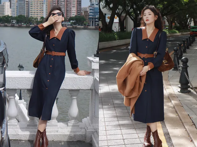 一件拼接撞色的港风仿牛仔连衣裙,配上棕色的中筒靴,满满的复古气息,给人一种穿越的感觉,似乎一下子回到了上个世纪。撞色的衣领、腰带还有衣袖,看起来很有高级感。