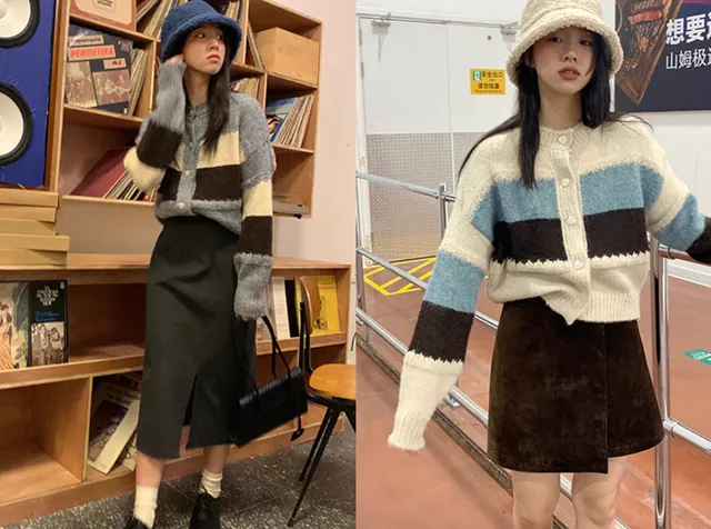 撞色慵懒风格的针织开衫,搭配半身裙,软糯的感觉,真的好美。做一个温柔的小女生,未尝不是一件好事。
