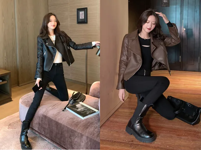 非常帅气的小皮衣外套,也是整个季节的不错选择,黑色和棕色属于深色系,是显瘦的颜色,配上一件小脚裤,特别的时髦。