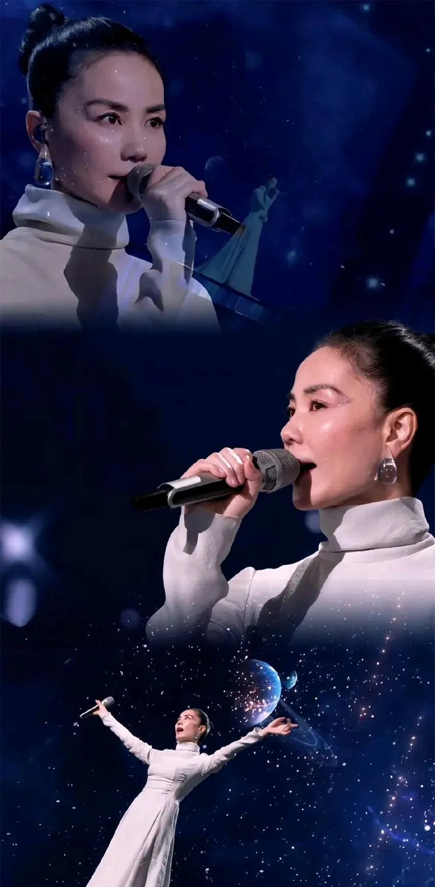 王菲开嗓,依然惊艳全场。气息沉稳,面容静美。去年的虾片耳饰引领时尚,今年的透明水滴内那一抹蔚蓝同样绚烂动人。