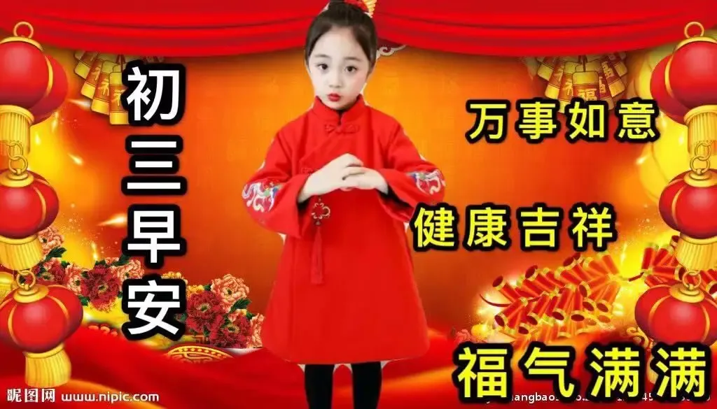 3、 早上好,亲爱的朋友。今天是大年初三,拜个年,问声好。福禄寿喜来拜访,其乐融融喜团圆。今天收到这份祝福的人,注定2022年一整年里。福星高照,万事顺心。