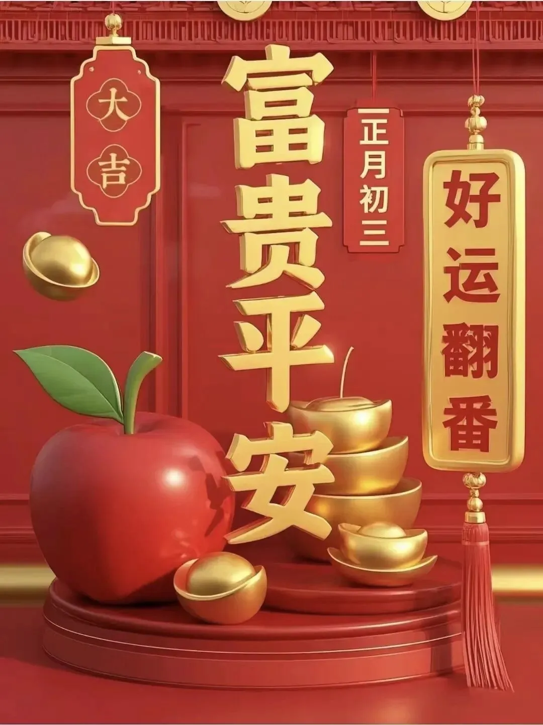 初三早安,岁岁平安🏮 正月初三,福气盈门,吉祥满院🌸 愿你风里雨里都有依靠,朝朝暮暮皆有欢喜😊 平安健康是最大财富,开心快乐是最好礼物,马年顺顺利利,和和美美,幸福长久✨