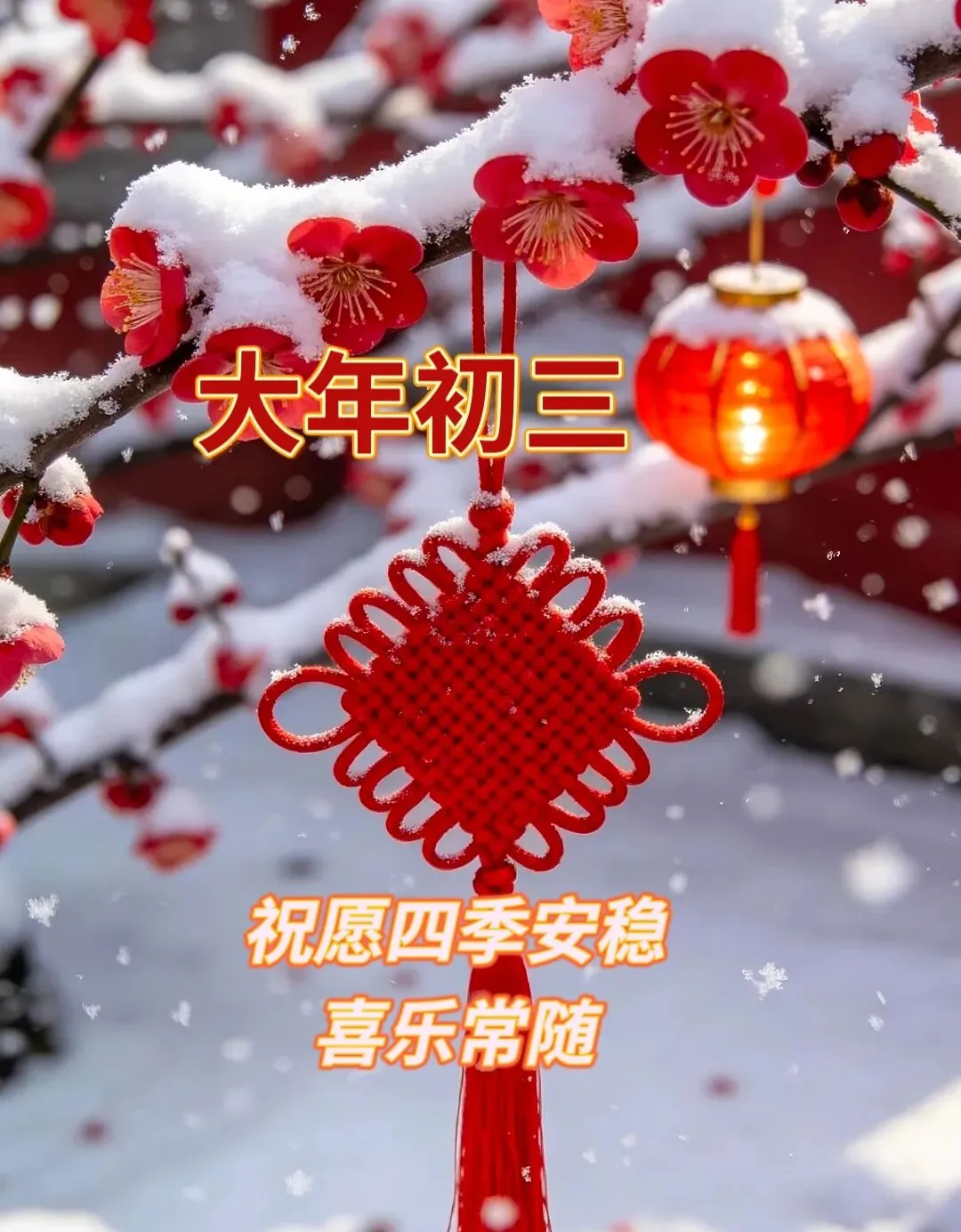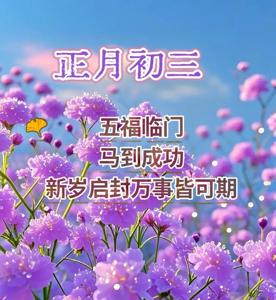 大年初三送祝福,好事连连不间断,四季欢笑乐无边。生活如画色彩斑斓,心情灿烂如彩虹,烦恼抛到九霄外。人人幸福,十全十美!早安!
