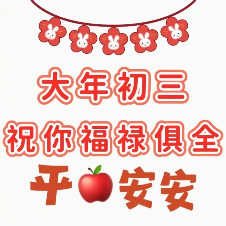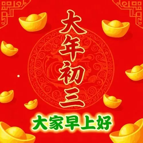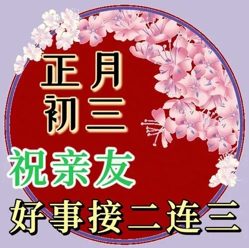 大年初三,早上好送祝福,喜气洋洋送吉祥。一送,好运不可挡,天天赚钱幸福忙。二送,温情心中藏,朋友之间莫相忘。三送,福禄与健康,愿你身体强又壮。四送,幸福万年长,祝你快乐又安康。