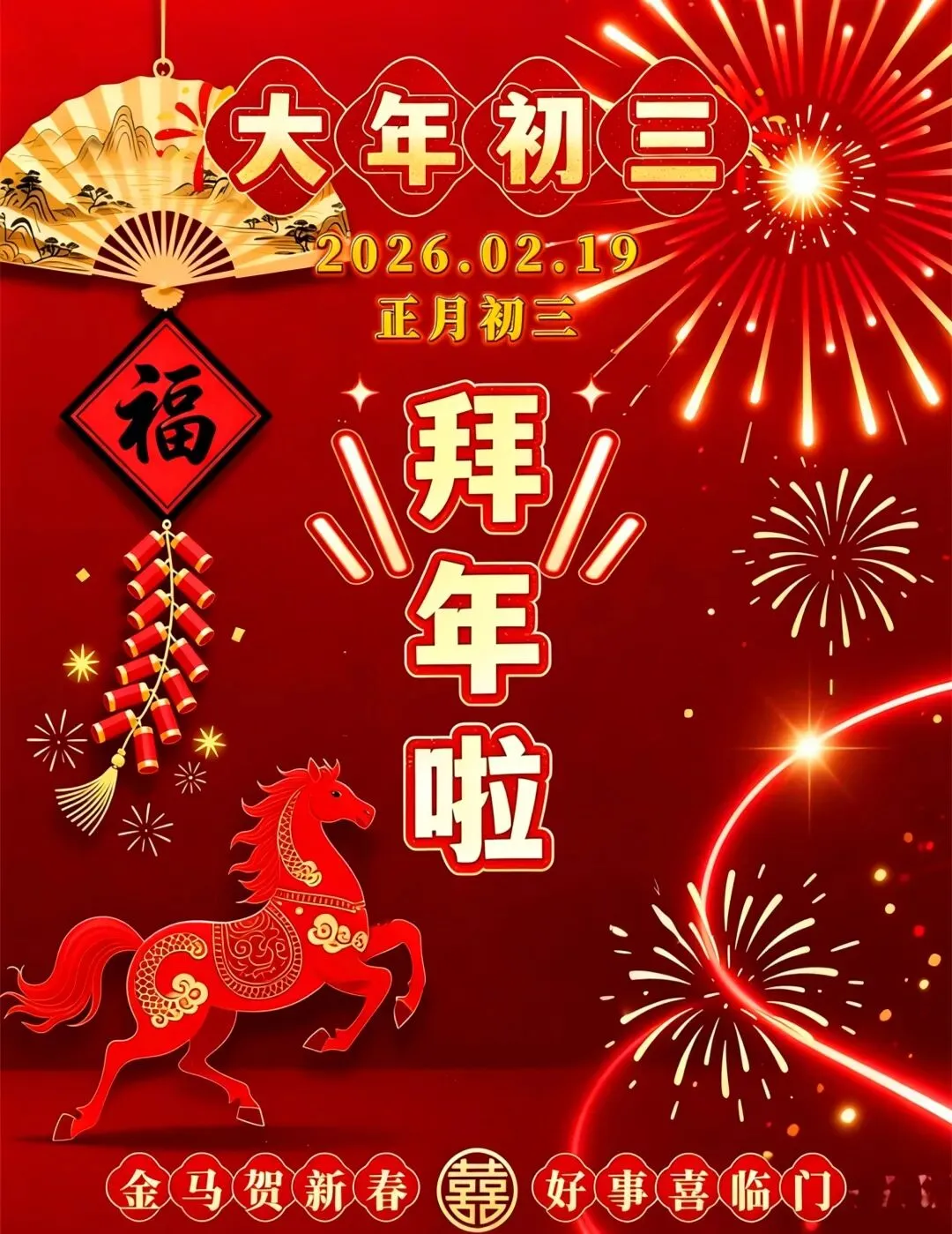 大年初三到,祝福问候送不停,愿您天天好心情!愿你在2026年的岁月中,如骏马一样奔腾,跨越所有障碍!马年龙马精神,活力满满!