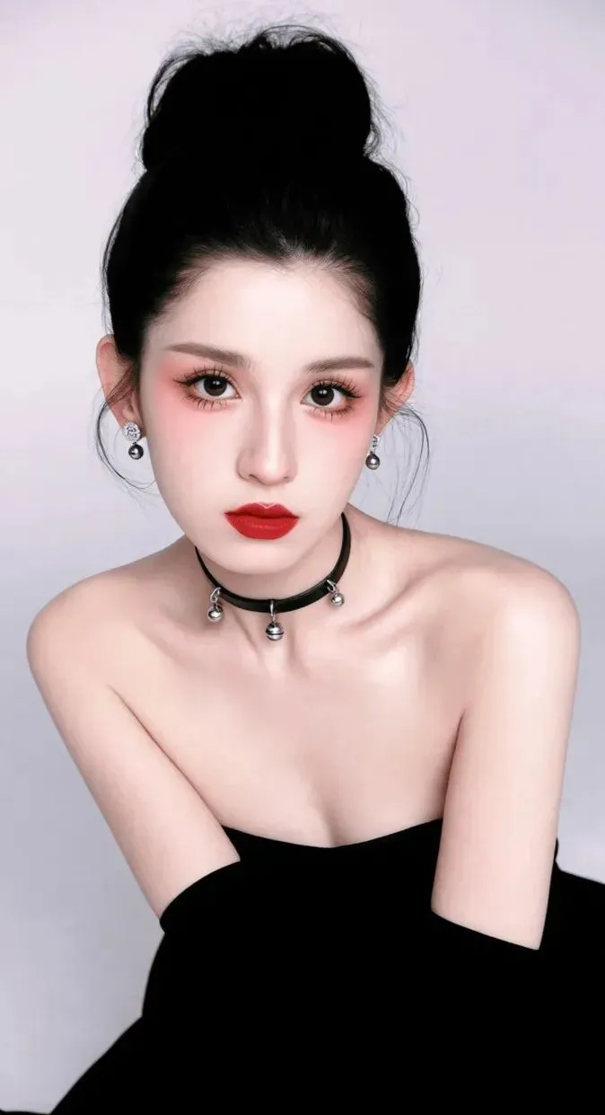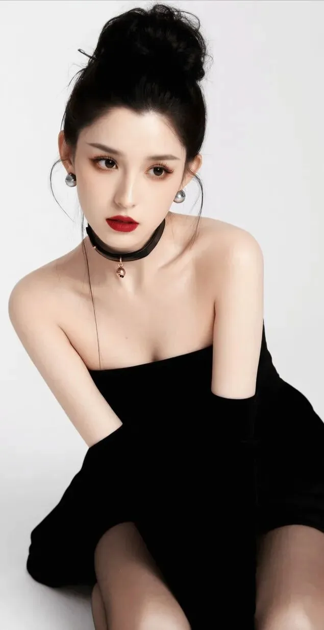 眼尾上扬的锋利眼线、正红色的饱满唇妆,配合她微微前倾的蓄势姿态,浑身散发着如野豹般的致命吸引力,那是属于夜晚的、带着危险与魅惑的性感之美。