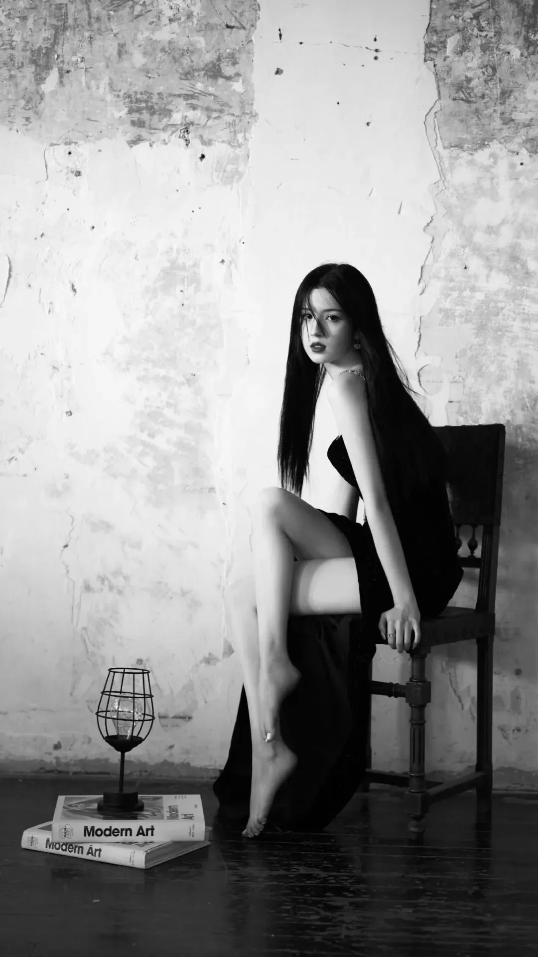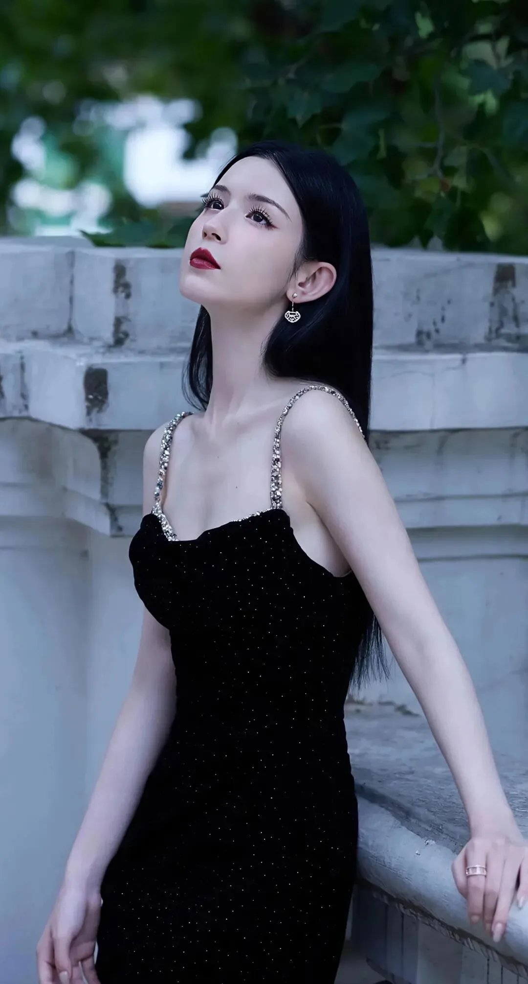 而当镜头切换至现代摄影棚,她又化身暗夜中蓄势待发的野性精灵。一袭黑色单肩连衣裙紧紧贴合她玲珑有致的身材,金属链条在腰间勾勒出不羁的朋克气息。