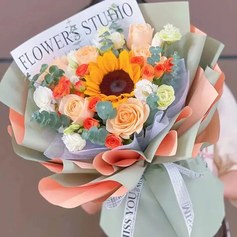 真挚祝福- 香槟玫瑰3枝、向日葵3枝、橙色多头玫瑰2枝、尤加利叶5枝