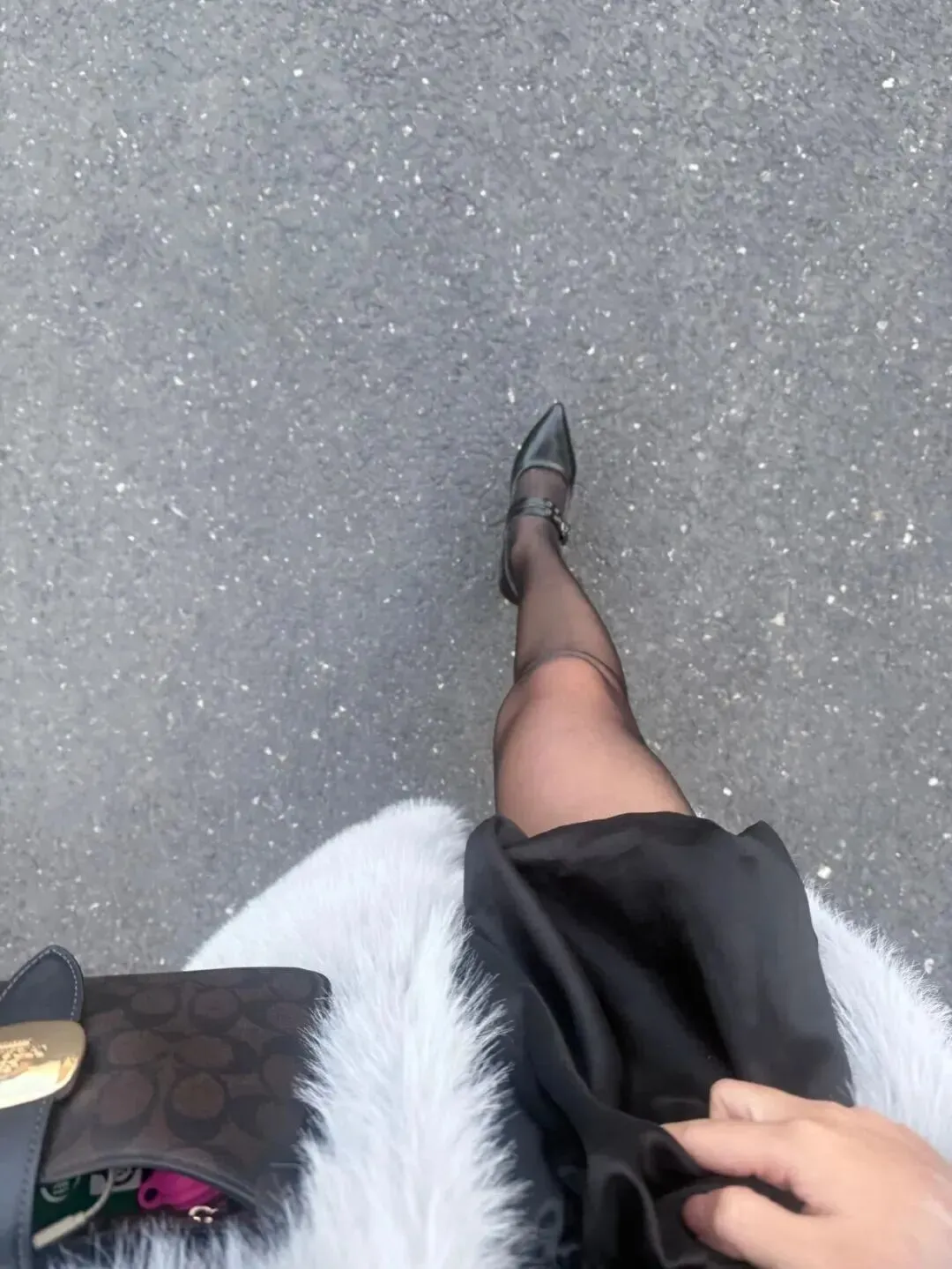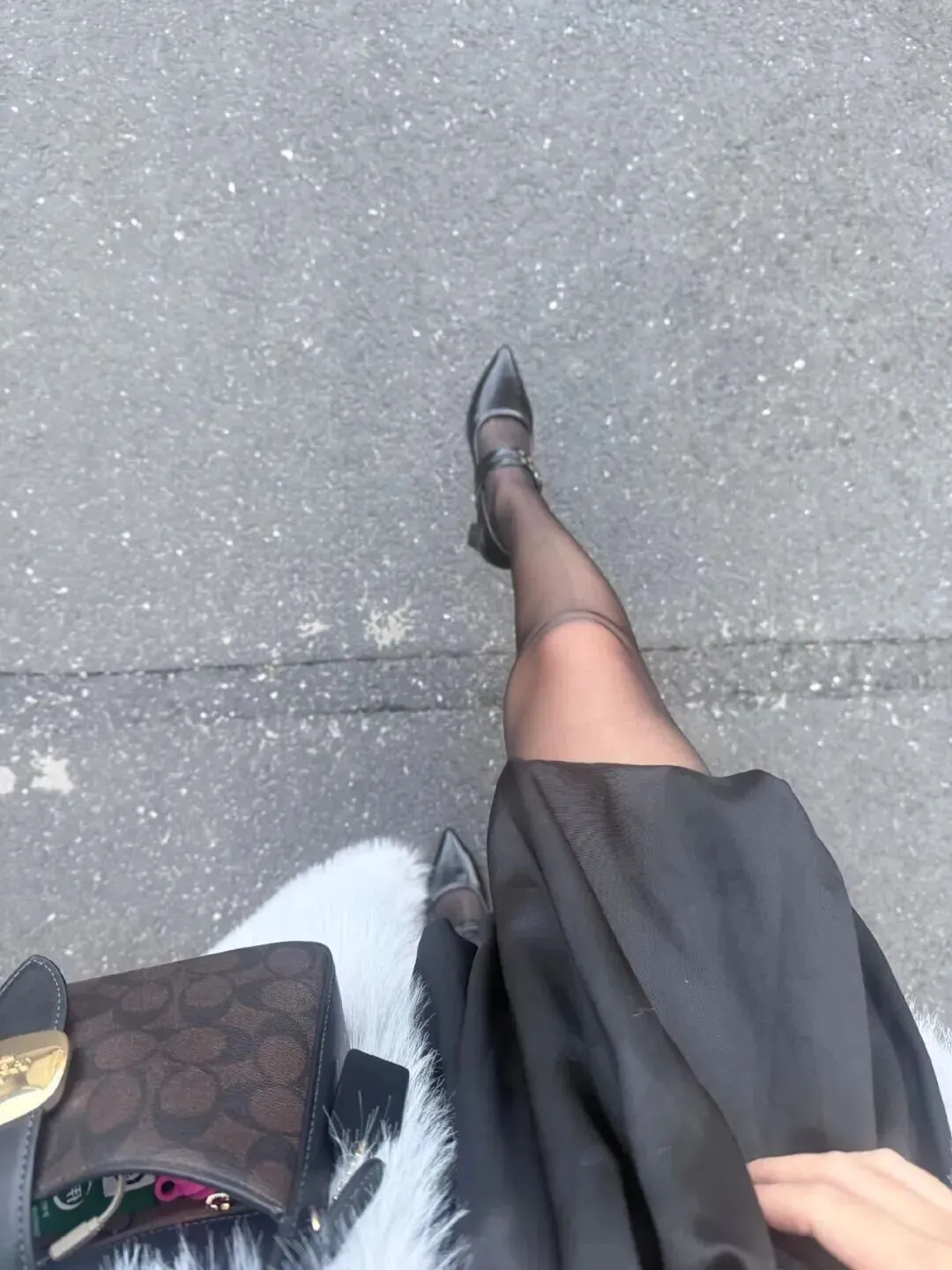 忍不.住多.看了几眼.,发现这套.搭配真的细.节满满.。黑.色丝质.短裙在阳光.下有淡淡的.光泽.,薄透.的丝袜.若隐若.现,.配上尖.头高.跟鞋,整个.人显.得特.别修长。最.妙的.是那个棕.色老花包,.给一身黑.色加了.点复古味道.。偷偷瞄.到包里露出.彩色小挂件.,原来.高冷.外表下.藏着可可爱.爱的小心.思。