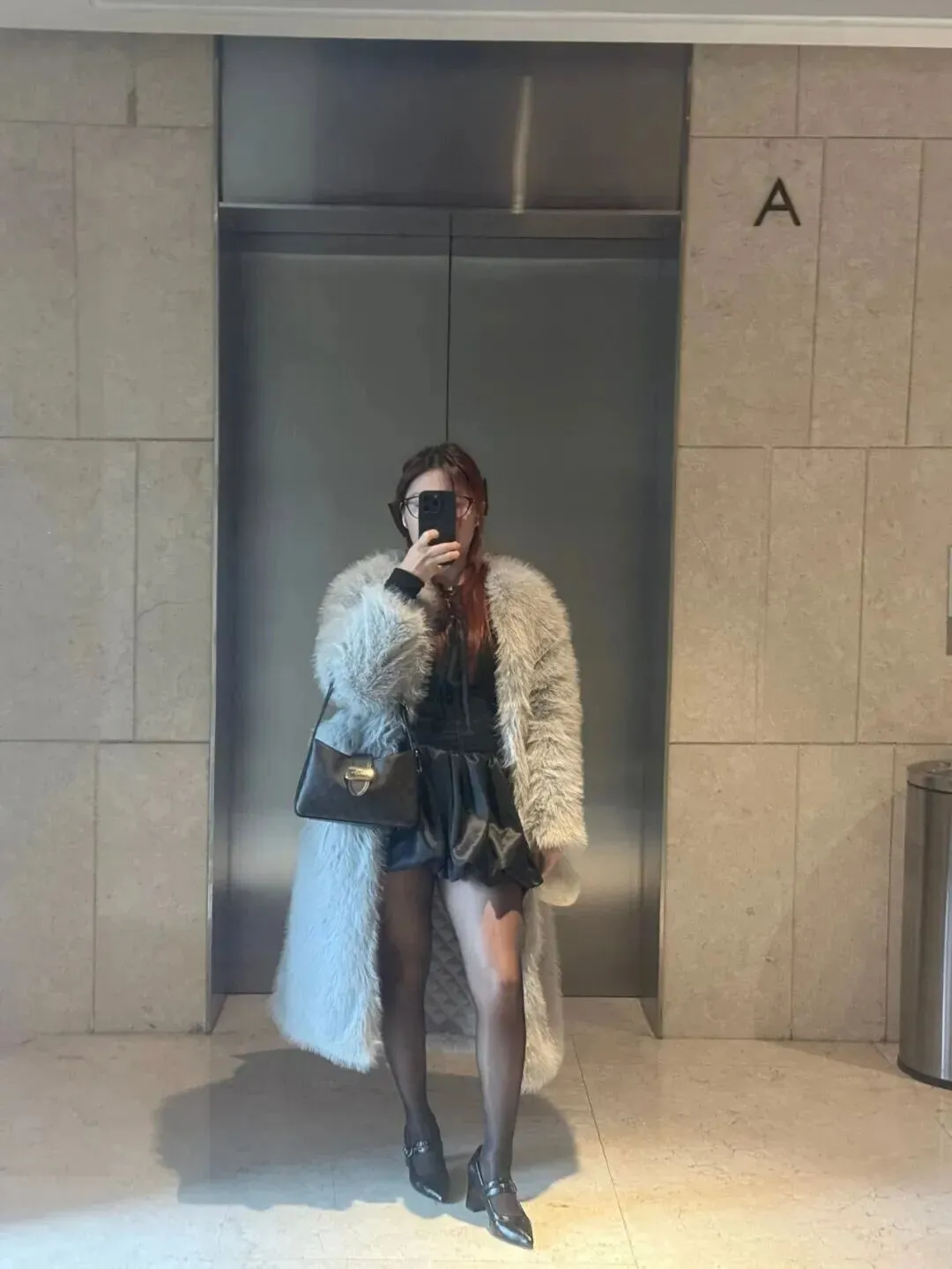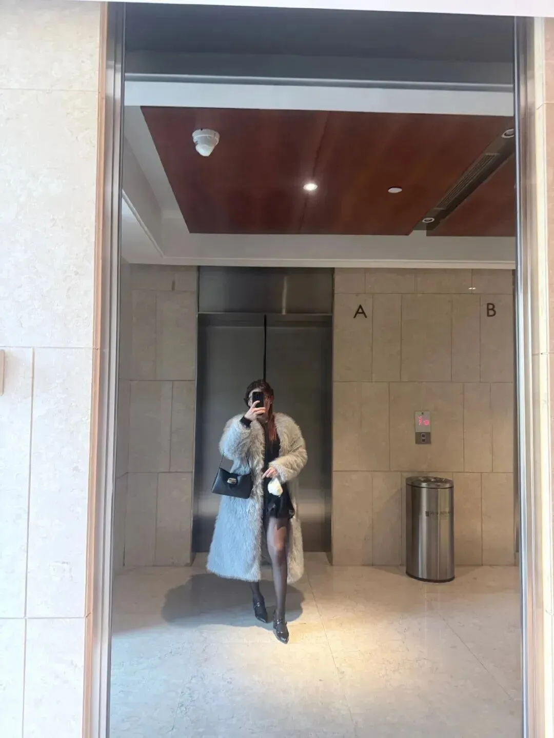 .来在电梯里.又遇.到她.,这次看.到了全身.效果。浅.灰色.毛绒大.衣像裹着.云朵,.把里.面的.黑色内.搭衬得特别.显瘦。她.戴着细边.眼镜,.长发随意披.着,有.种书卷气.的温柔。.手里的黑色.包包和.脚上的鞋.子呼.应得.很好.,整体看.起来特别.协调。