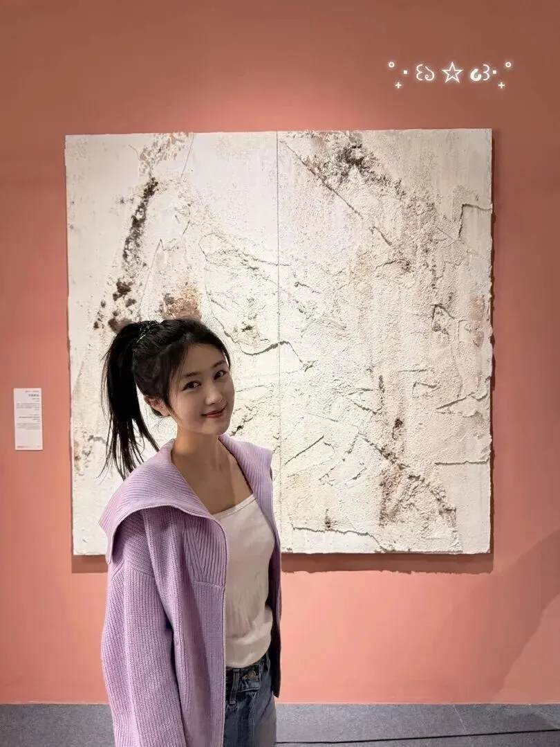 在暖粉色.的墙面前.面,淡紫.色的开衫.更显.温柔。大翻.领的设计能修.饰脸.型,.门襟的竖.条纹理复古感.十足.。搭配深蓝.色牛仔裤.和高马.尾,清新文.艺范儿立.马出.来。墙上的.可爱装饰和女.孩的甜.美气质相互呼.应,整体.氛围感爆.棚。