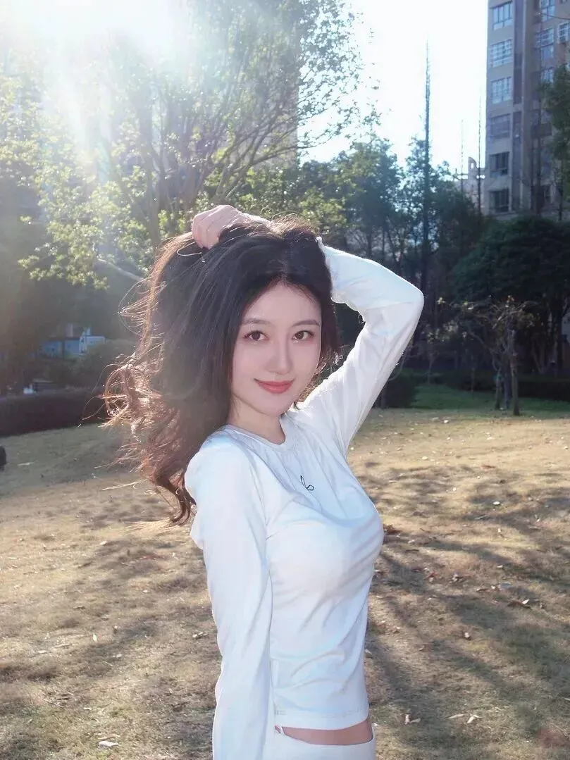 .天气好的.时候,.去草坪上走.走,运.动风穿.搭正合.适。米.白色的紧身长.袖T恤.,搭.配高腰.下装,露出小.蛮腰.,显得活力.十足。深棕.色的大波.浪卷发在.风中飘.动,阳光照.过来.,发丝.闪闪发光.。侧身站着.,随手抓抓.头发,动作.自然又.迷人。秋日午.后,这种穿.搭让.人感觉特别放.松。